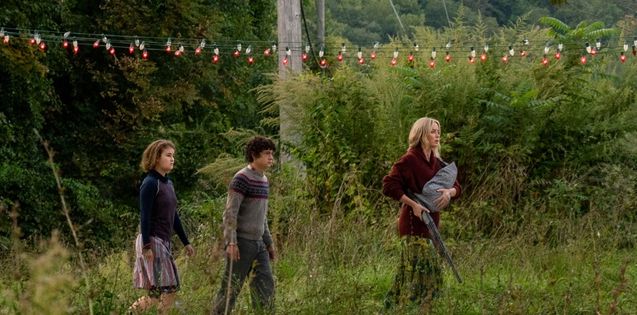 朗那讓人想到還是覺得痛的「腳傷」包紮就知道了),但畢竟他們已經知道了怪物的弱點,於是艾蜜莉布朗帶著兒女(然後為了避免新生兒的哭聲,是將小嬰兒戴上氧氣罩後放在做好隔音的密閉提籃中)離開了原本住家附近佈好「沙道」的生活圈,一方面尋找外界更多的資源,另一方面也是為了將這個發現帶給外人,好拯救其他的倖存者!