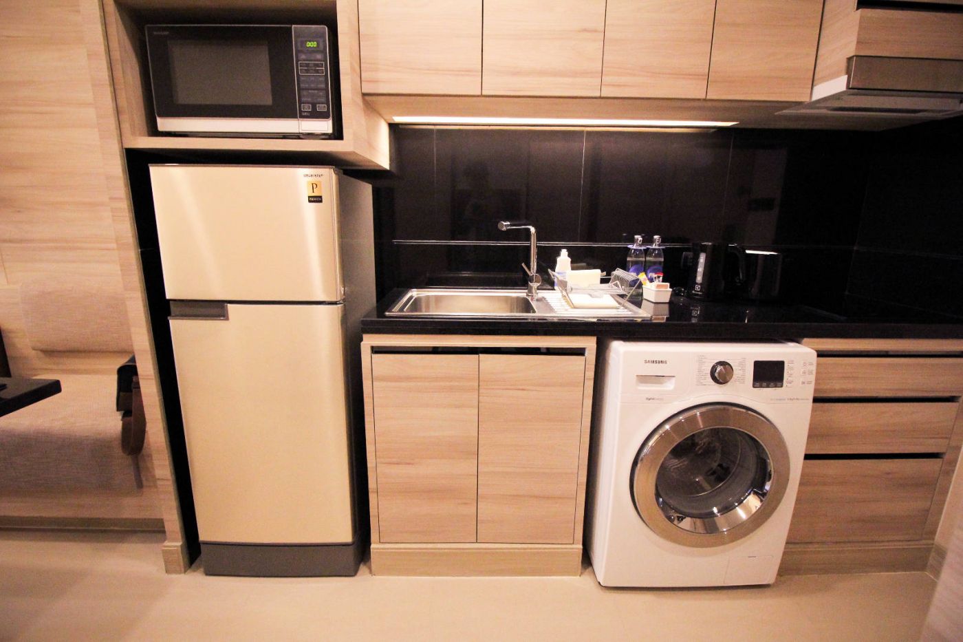ภาพที่ 2 : สิ่งอำนวยความสะดวกภายในห้อง - เครื่องซักผ้า เตาไฟฟ้า อ่างล่างจาน ไมโครเวฟ ตู้เย็น