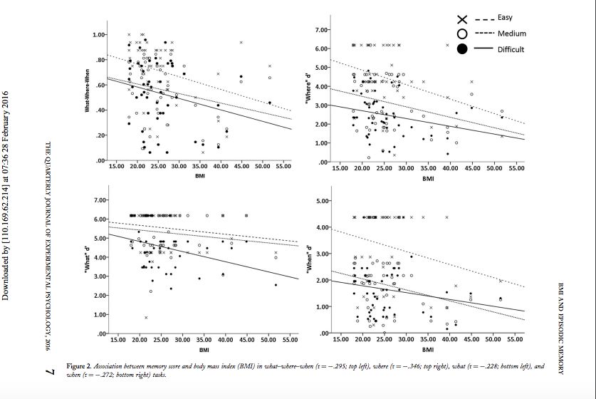 โดยนักวิจัยค้นพบว่าคนที่มีค่า BMI หรือดัชนีมวลกายสูง จะมี "ความจำอาศัยเหตุการณ์" หรือ "episodic Memory" ที่แย่ (อธิบาย : episodic memory เป็นความจำส่วนที่ใช้จำเหตุการณ์ต่างๆ ในชีวิตตัวเองนั่นเอง