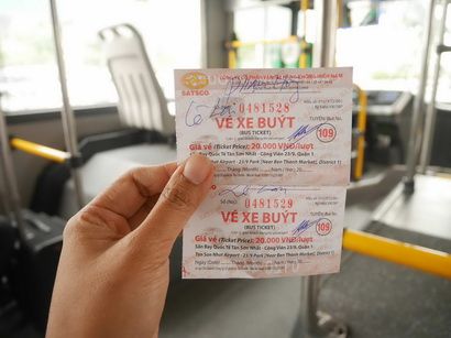 ซื้อซิมแล้วactivateเสร็จเดินออกมา หืมมมม มีความรู้สึกเหมือนดารามีคนชูป้ายไฟต้อนรับเพียบ เดินฝ่าแฟนคลับไปทางขวาค่ะ มองหาเบอร์เกอร์คิง ท่ารถเมล์อยู่ตรงนั้นจ้า มีสาย 152 ไม่มีแอร์ (5,000ด่อง=8บาท) กับ 109 เป็นแอร์พอร์ทบัสมีแอร์ (20,000ด่อง=30บาท) เลือกที่มีแอร์ซิคะจะรออะไร พี่คนขับ+คนขายตั๋วพุ่งมาเลยจ้า พูดดีมากช่วยดูว่าเราต้องลงป้ายไหนแล้วเค้าจะเรียกยกกระเป๋าขึ้นไปวางให้เสร็จ เดินตัวปลิวขึ้นรถไปสวยๆ