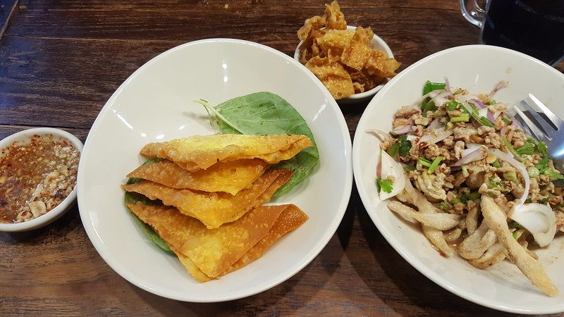 "เกี๊ยวทอด" มาก่อนเพื่อนเลย ให้นั่งกินกันเพลิน ๆ โลมาชอบน้ำจิ้ม ใส่ถั่วด้วยรสชาติอร่อยดี ตามมาติด ๆ ด้วย "ยำกากหมู" มาเป็นแท่งยาว ๆ ใส่หมูสับด้วย จานนี้โลมาก็ชอบ สำหรับคนชอบแซ่บ ต้องปรุงเพิ่มจ้า