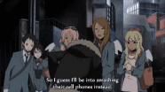 จริงๆเราเป็นเมนชิสึโอะกับอิซายะนะคะ ชอบพอๆกันทั้งคู่เลย จริงๆชอบทั้งตัวละครทั้งนักพากย์เลยนี่แหละค่ะ แงงง รู้สึกว่าเวลาแคสนักพากย์มามันดูเหมาะกับคาแรกเตอร์ตัวละครจริงๆ เราชอบเวลาคามิยันทำเสียงจิตๆแบบอิซายะนะคะ มันดูเซ็กซี่ดี #เอ๊ะ 5555 ฉากที่ชอบที่สุดของอิซายะคงหนีไม่พ้นฉากกระทืบโทรศัพท์ในตำนานที่อิซายะกระทืบไปแล้วหัวเราะไป เราว่ามันดูโรคจิตมากเลยล่ะค่ะ 555
