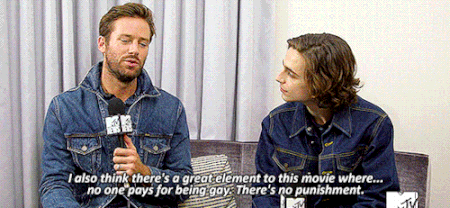 [Call Me By Your Name] เป็นหนังเกย์ เพราะมันมีเรื่องเซ็กซ์และประสบการณ์แบบเกย์ แต่ในขณะเดียวกันก็ไม่ใช่หนังเกย์เพราะมันเป็นหนังเกี่ยวกับเอลิโอกับโอลิเวอร์ และใครเล่าจะรู้ว่าในอนาคตพวกเขาจะกลายเป็นอะไร ยังไงก็ตาม นี่อาจจะ...เป็นหนังไบเซ็กชวลเรื่องแรกก็ได้ อย่ากีดกันไบเซ็กซวลกันดีกว่านะ" ส่วนอาร์มี่ แฮมเมอร์ เจ้าของบทโอลิเวอร์ ก็ได้นิยามหนังเรื่องนี้ไว้อย่างงดงามว่า