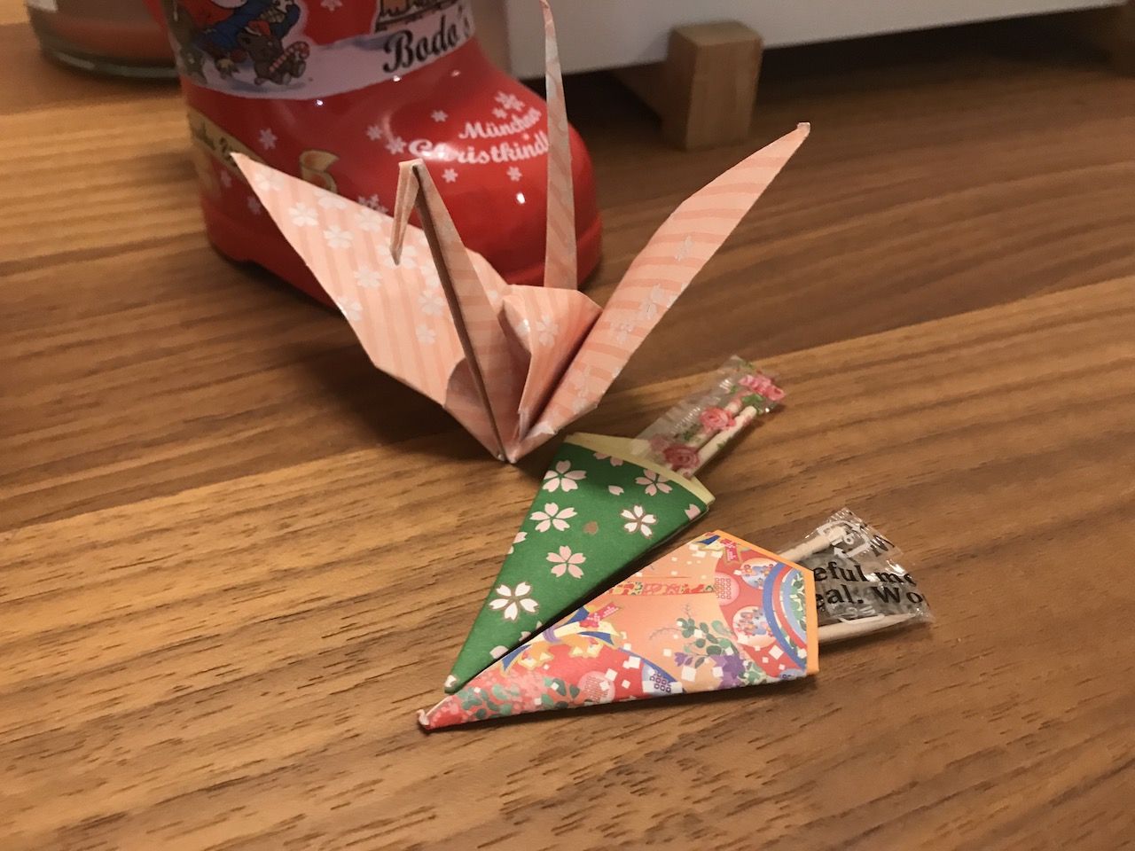 อีกเรื่องนึงที่ทำให้ใจฟูมีกำลังใจในการทำงานมากๆก็คือคุณผู้โดยสารวุ้นแปลภาษานั้นก็เป็นคุณป้าที่มาเที่ยวกรุ๊ปเดียวกับคุณป้าที่เกิดอุบัติเหตุนั่นแหละ หลังจากเกิดเรื่องแกก็เดินวนเวียนจากที่นั่ง 82C มาเยี่ยมเยียนอย่างสม่ำเสมอ เราว่าแกคงสังเกตเราอยู่ด้วยแหละมั้งนะ แกเลยเรียกให้เราไปหาตรงที่นั่งแล้วก็หยิบนกกระเรียนกระดาษกับซองใส่ไม้จิ้มฟันกระดาษมาให้ บอกว่าเป็นของขวัญ แกพับของแกเองเลยนะ แล้วก็บอกว่า