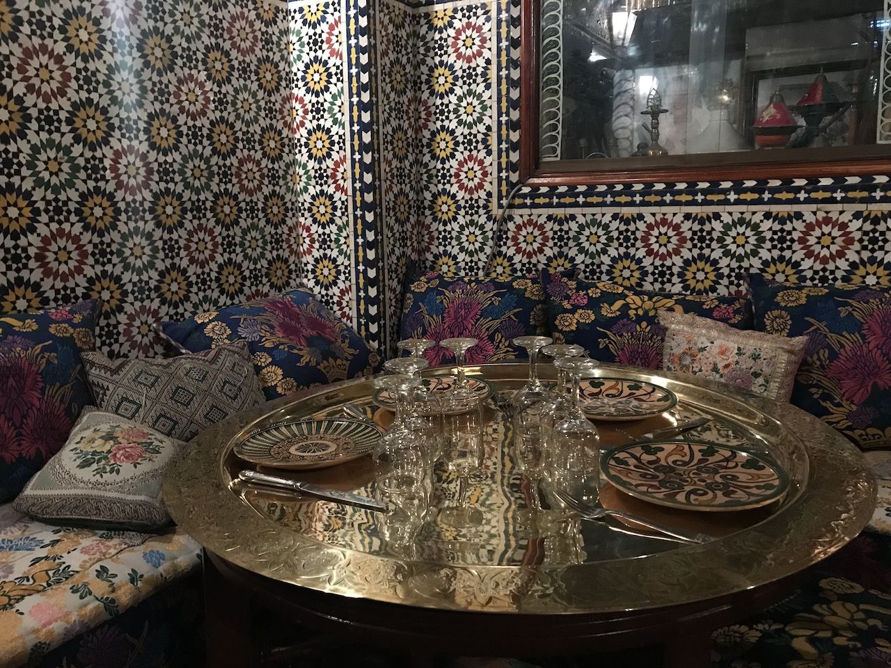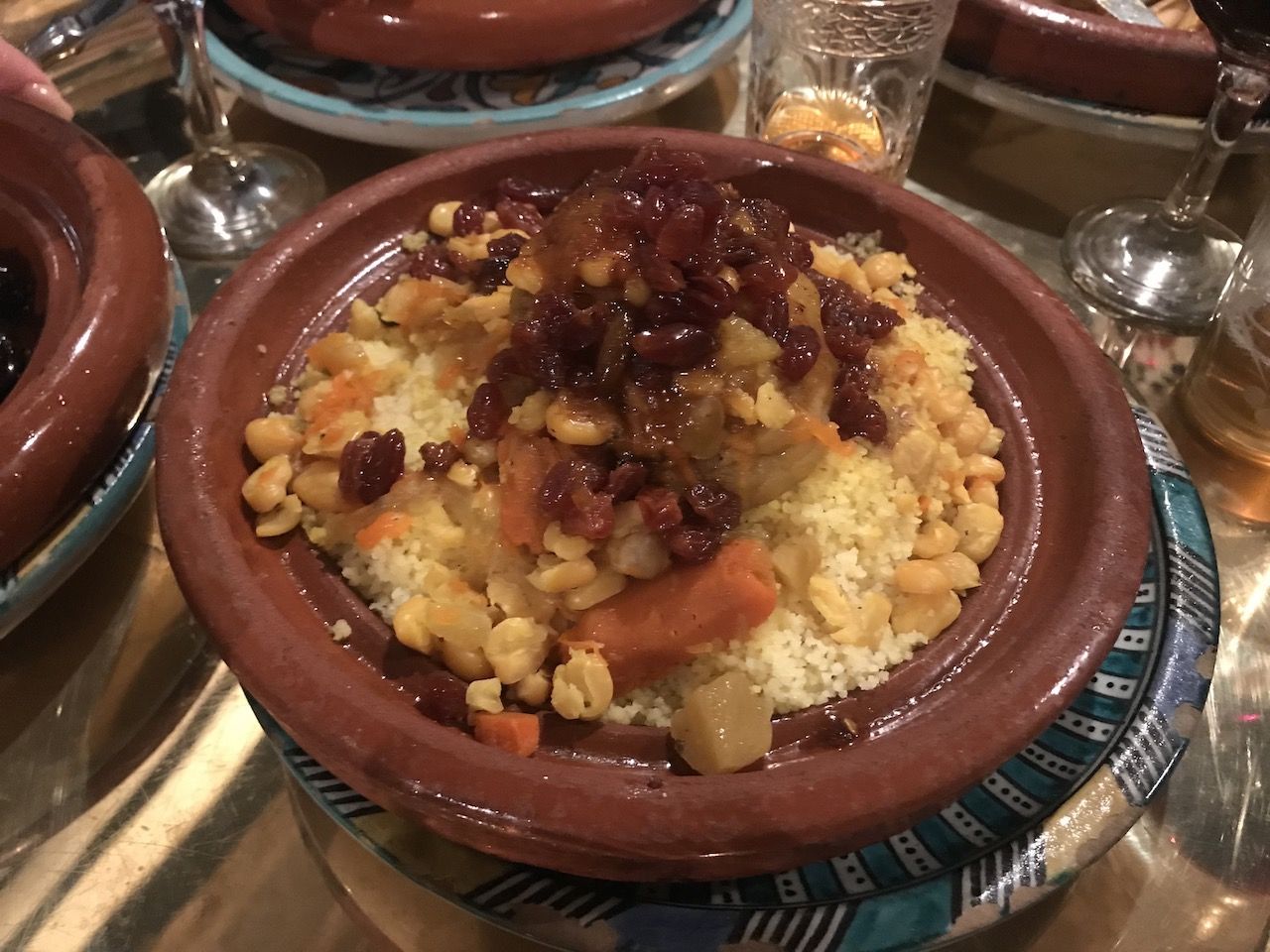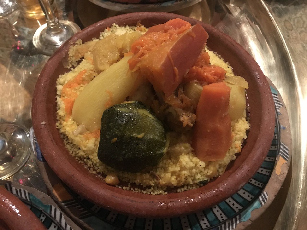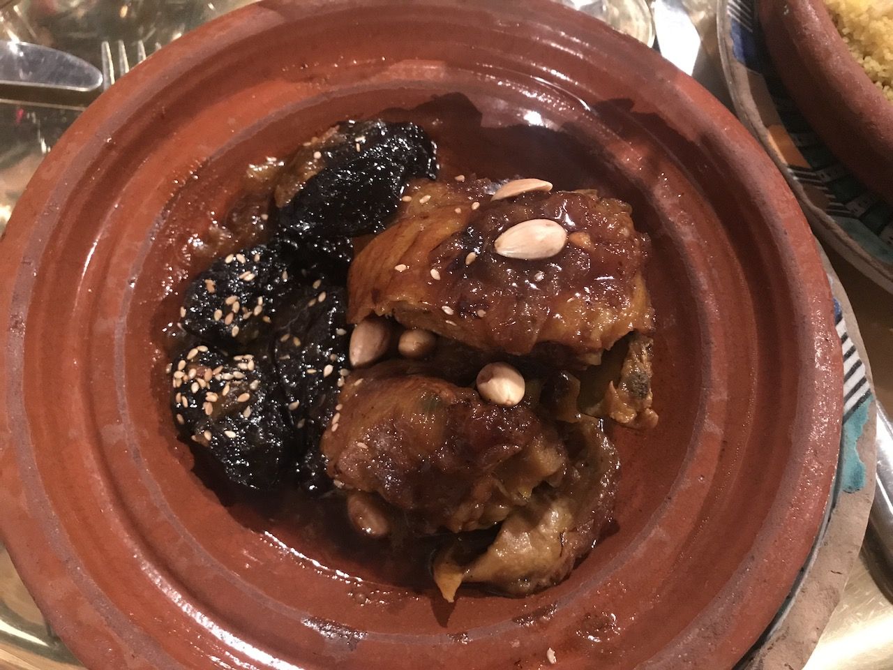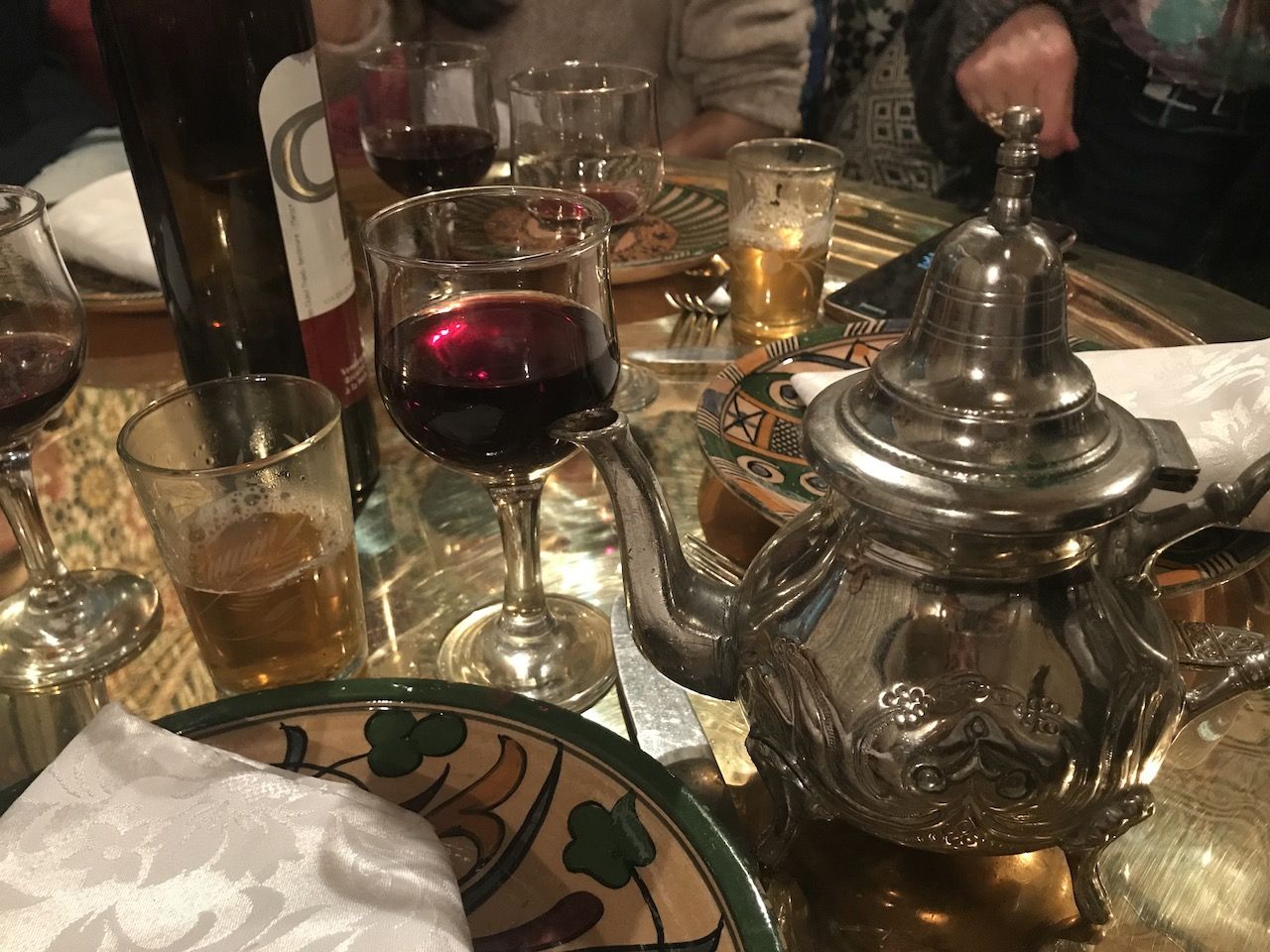 สรุปคือได้ couscous มาสองหน่วย เพราะไม่รู้ว่ามันต่างกันยังไง ก็แชร์กันเนอะ (รู้ตอนหลังคือแบบนึงใส่ผัก อีกแบบใส่เนื้อ) และ Tagine d’Agneau aux Pruneaux มาหนึ่งหน่วยสำหรับตัวเอง คือแปล Poulet ออกแต่อันที่สั่งนี่แปลไม่ออก เลยเอาอันที่แปลไม่ออกก็แล้วกัน ท้าทายดี ชีวิตมันต้องตื่นเต้นสิโว้ย แล้วก็สั่งไวน์แดงมาหนึ่งขวด พร้อม moroccan mint tea มาหนึ่งกา งดงามมมมม