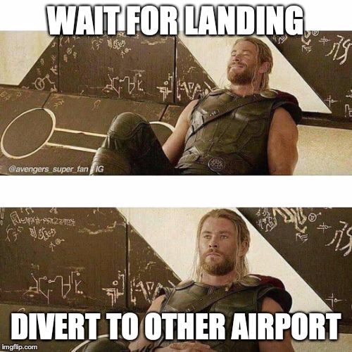 โอ้ยยยยยย ไฟล์ทก็ยาว เหนื่อยก็เหนื่อย คิดว่าจะกลับบ้านไปนอน แต่นี่อะไร ต้องไปลงอีกสนามบิน แล้วยังไง ต้องเติมน้ำมัน และไม่รู้ว่าอากาศมันจะดีเมื่อไรเนี่ยนะ อะไรกันวะเนี่ย นี่มันวันอะไรของกู๊วววว ผู้โดยสารก็เริ่มเลิกลั่กแล้ว ยังไงดี มีไฟล์ทที่ต้องต่อ จะทำยังไง นั่นนี่นู่นโน่น ทั้งเคบินวุ่นวายมาก เราก็ต้องบอกว่ายู นั่งก่อน เดี๋ยวจะแลนด์อีกสนามบินนึงแล้ว ใจเย็นก่อนนนนนนนน
