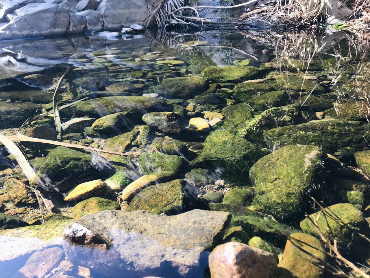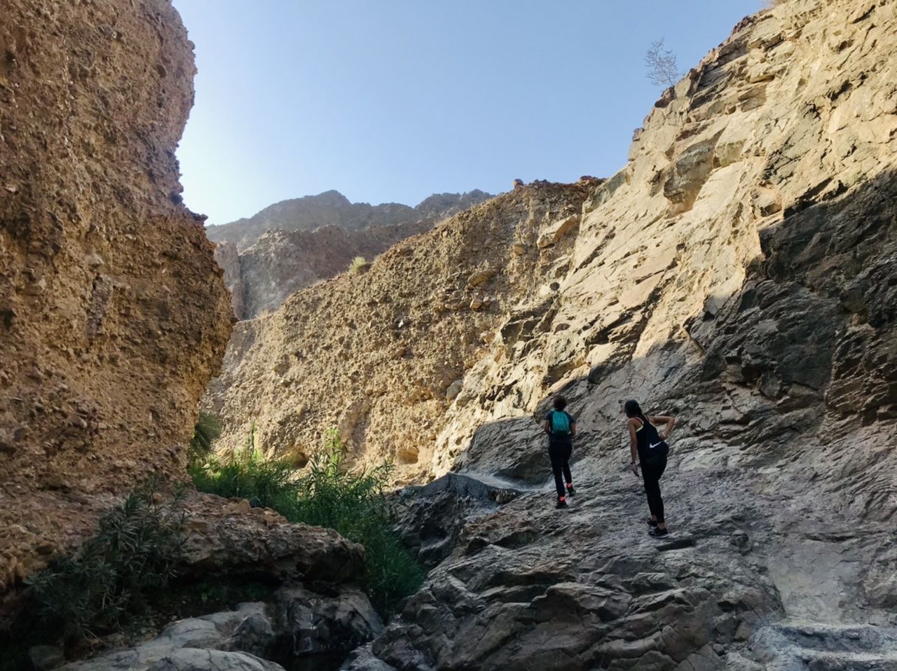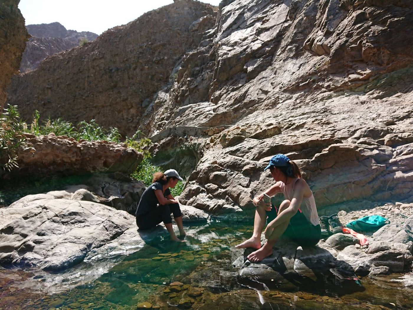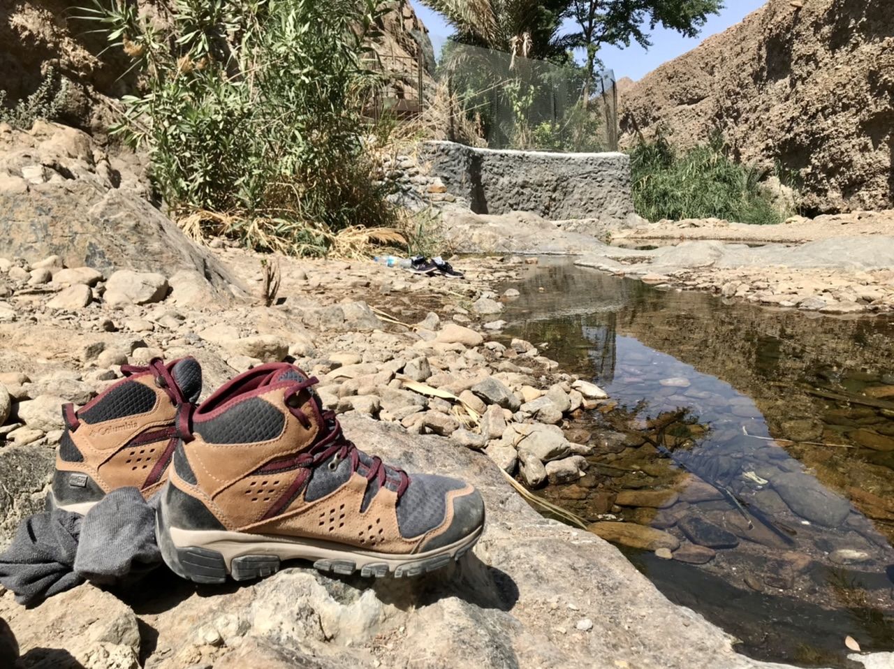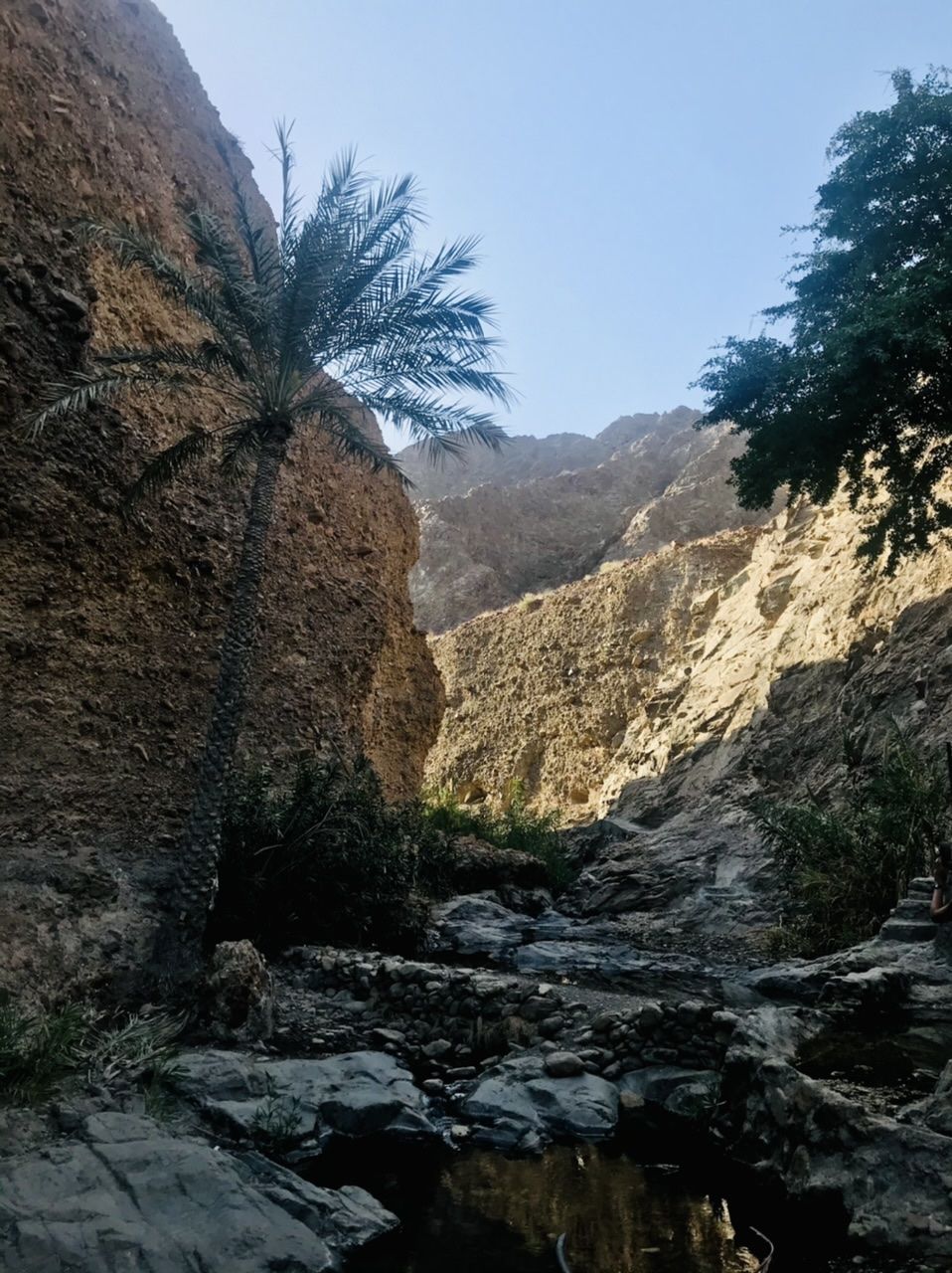 ในช่วงทางเดิน 1 กิโลเมตรแรกเราจะเจอกับสวนเล็ก ๆ ใต้ร่มเงาของภูเขาใหญ่ เจ้าของคือชาวบ้านในละแวกนี้นี่แหละค่ะ เขาผันน้ำเอามาใช้สำหรับการเพาะปลูกยังชีพ โดยพืชพันธุ์ที่ปลูกไว้ก็มีกล้วยและผลไม้ต่าง ๆ เมื่อเดินเลยจากบริเวณสวนจะเจอบ่อน้ำธรรมชาติเล็ก ๆ ที่น้ำใสสะอาดชวนให้รู้สึกชื่นใจ ได้ยินเสียงน้ำไหลเอื่อย ๆ แล้วชวนให้ใจสงบ พร้อมทั้งชมต้นไม้เขียวนานาพันธุ์ที่หาได้ยากยิ่งในเมืองทะเลทราย