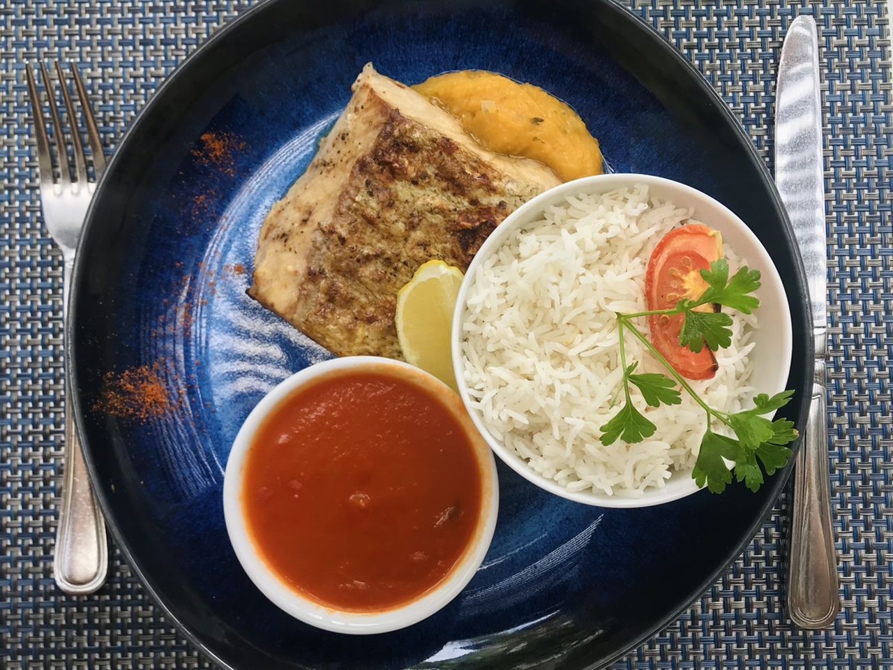ส่วนซอสสีส้ม ๆ แดง ๆ นั้นเป็นซอสสูตรพิเศษของชาวครีโอลในเซเชลส์โดยเฉพาะ เรียกว่า Lasos Kreol ซึ่งทำมาจากมะเขือเทศ พริกหยวก หัวหอมใหญ่ และกระเทียม ปรุงรสด้วยเครื่องเทศและพริก เป็นซอสที่เอาไว้รับประทานคู่กับปลาย่าง พอเอาทุกอย่างบนจานมารวมกันมารับประทานในคำเดียวก็คือ Perfect bite เลยค่ะ