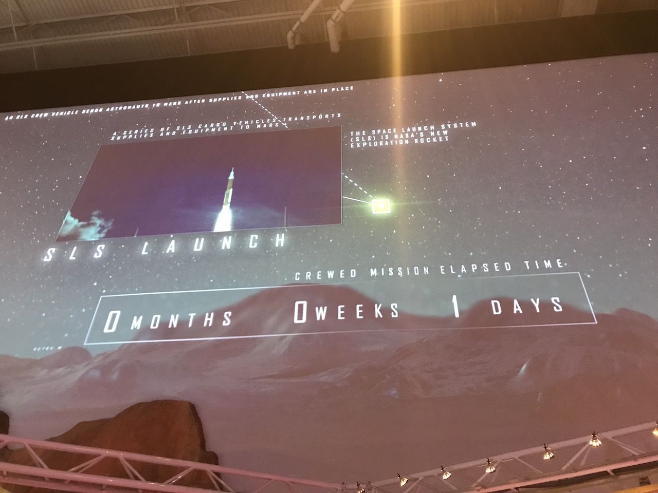 โซนแรกของ Mission Mars จะเป็นการอธิบายคราวๆเกี่ยวกับดาวเคราะห์สีแดงดวงนี้ว่ามีลักษณะเป็นอย่างไร และอธิบายเกี่ยวกับโครงการสำรวจว่า ณ ตอนนี้เราเก็บข้อมูลอะไรมาบ้าง มีหน้าจอให้กดๆ มีสกรีนให้จิ้มๆ(เด็กๆชอบมาก) จากนั้นก็มีอธิบายเกี่ยวกับ NASA's Space Launch System หรือ SLS ที่จะเอาไว้ส่งยานอวกาศไปยังดาวอังคารว่าประกอบด้วยอะไรบ้าง อันไหนจะแตกหลุดออกมาที่ชั้นบรรยากาศใด