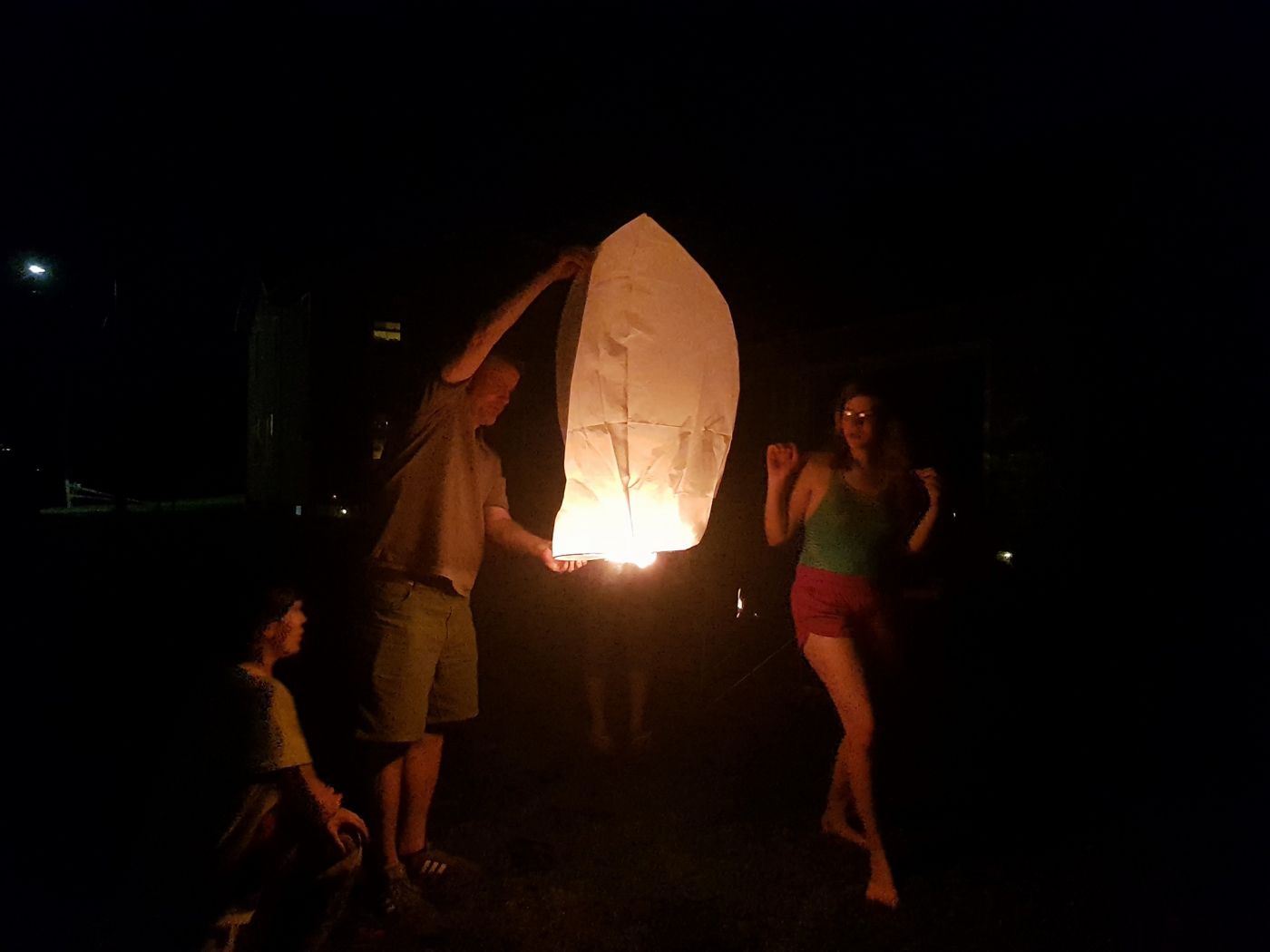 พอเราทำความสะอาดกันพอได้แล้วผู้ใหญ่คนรู้จักก็ขับรถพาเราไปบ้านป้าของแมคเคนน่า ที่นั่นมีไก่วิ่งไปมาไม่เหมือนบ้านโฮสต์ที่ไก่อยู่ในกรงเรียบร้อย ฉันเลยได้ลองอุ้มไก่ตัวนึงด้วย จากนั้นเราเข้าไปกินเค้ก ร้องเพลง นั่งคุยกันจนดึก แล้วเราค่อยออกมานั่งล้อมกองไฟอยู่หลังบ้านและย่างมาชช์เมลโล่แล้วกินกับช็อกเกอร์แลตและแครกเกอร์ บางคนเดินออกมาไปสูบบุหรี่อยู่มุมนึง มันเป็นเรื่องธรรมดาของที่นี่ แต่ฉันยังไม่เคยลองหรอก