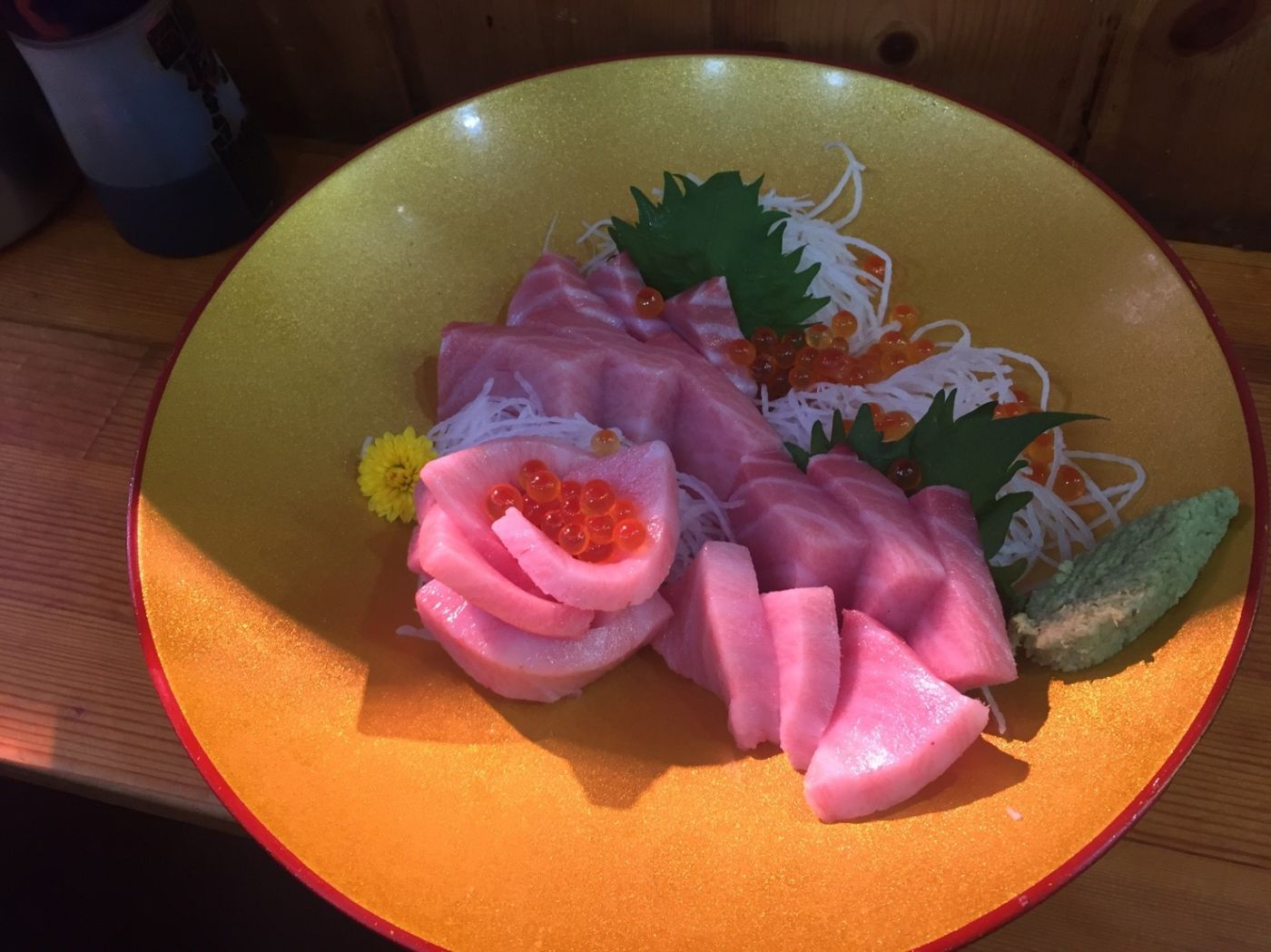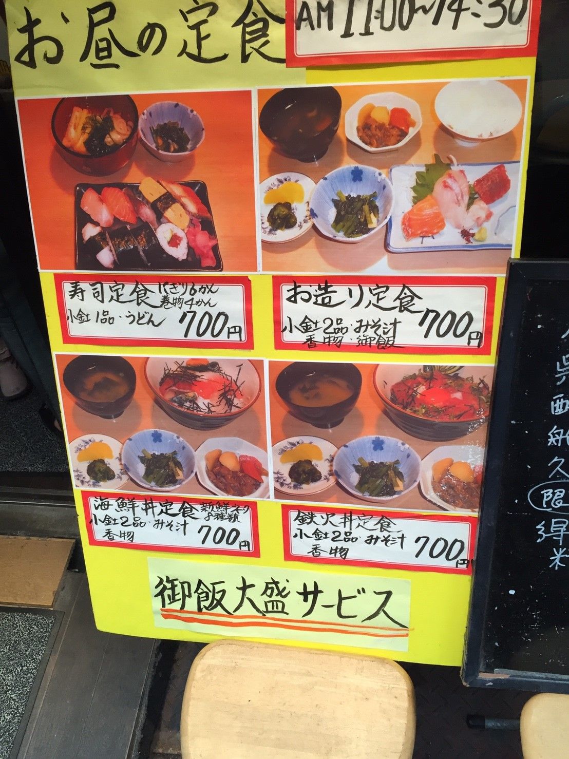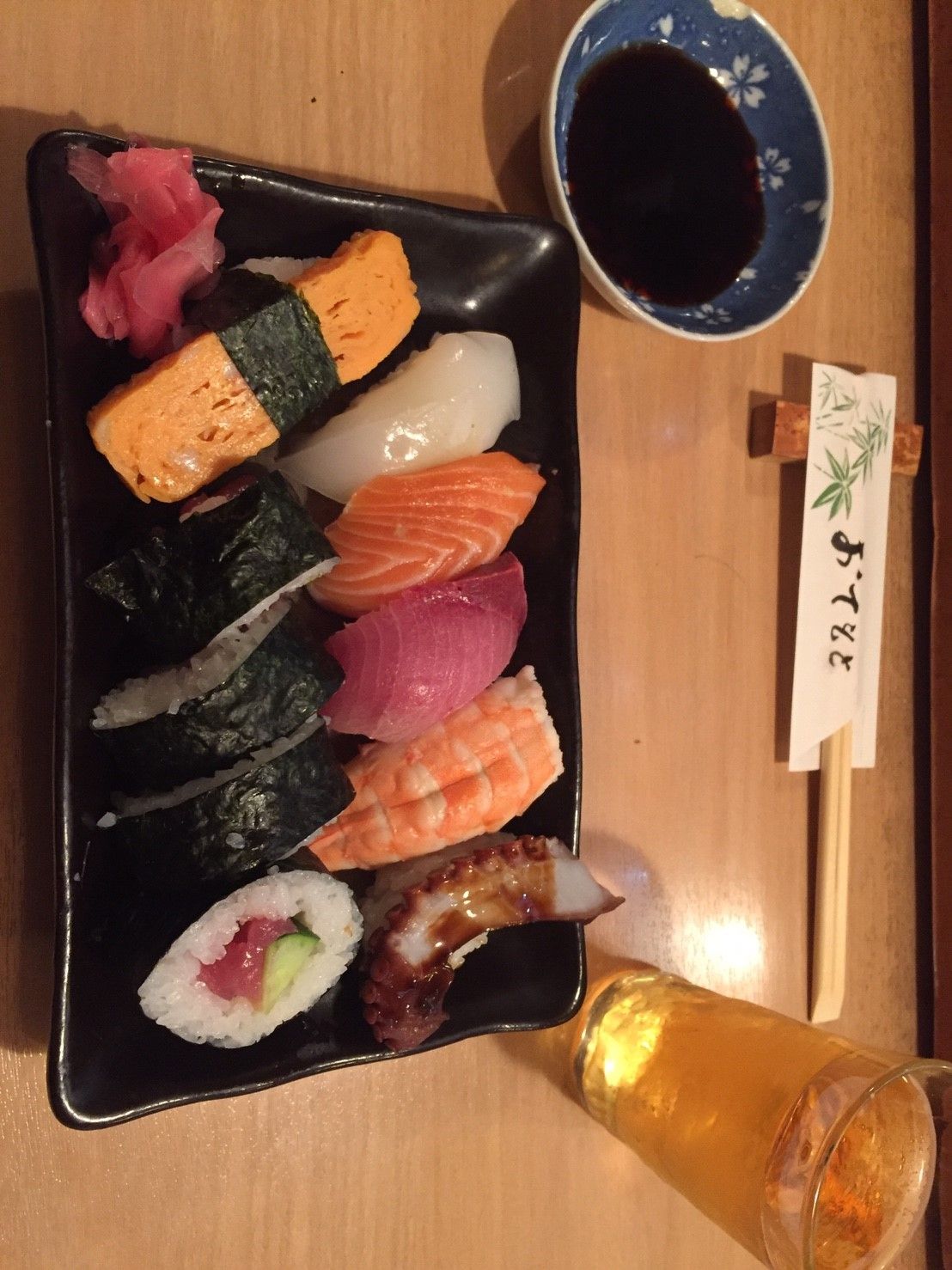 เดินเข้าไปถึงผมก็เจอรับน้องกันเลยครับ เพราะในร้านไม่มีภาษาอังกฤษเลยสักตัว เมนูก็มีแค่ที่หน้าร้าน ครั้นจะพูดกับลุงก็คุยกันไม่รู้เรื่อง สุดท้ายแล้วพวกเราเลยต้องไปถ่ายรูปเมนูหน้าร้านแล้วจิ้มๆ ให้ลุงดูว่าเอาอะไรบ้าง เราสี่คนสั่งชุดซูชิเซ็ท และเบียร์สองขวด เซทละ 700 เยน ได้ซูชิมาราวๆ 10 ชิ้น บะหมี่ชามเล็กๆ 1 ถ้วย และผักเครื่องเคียงนิดหน่อย