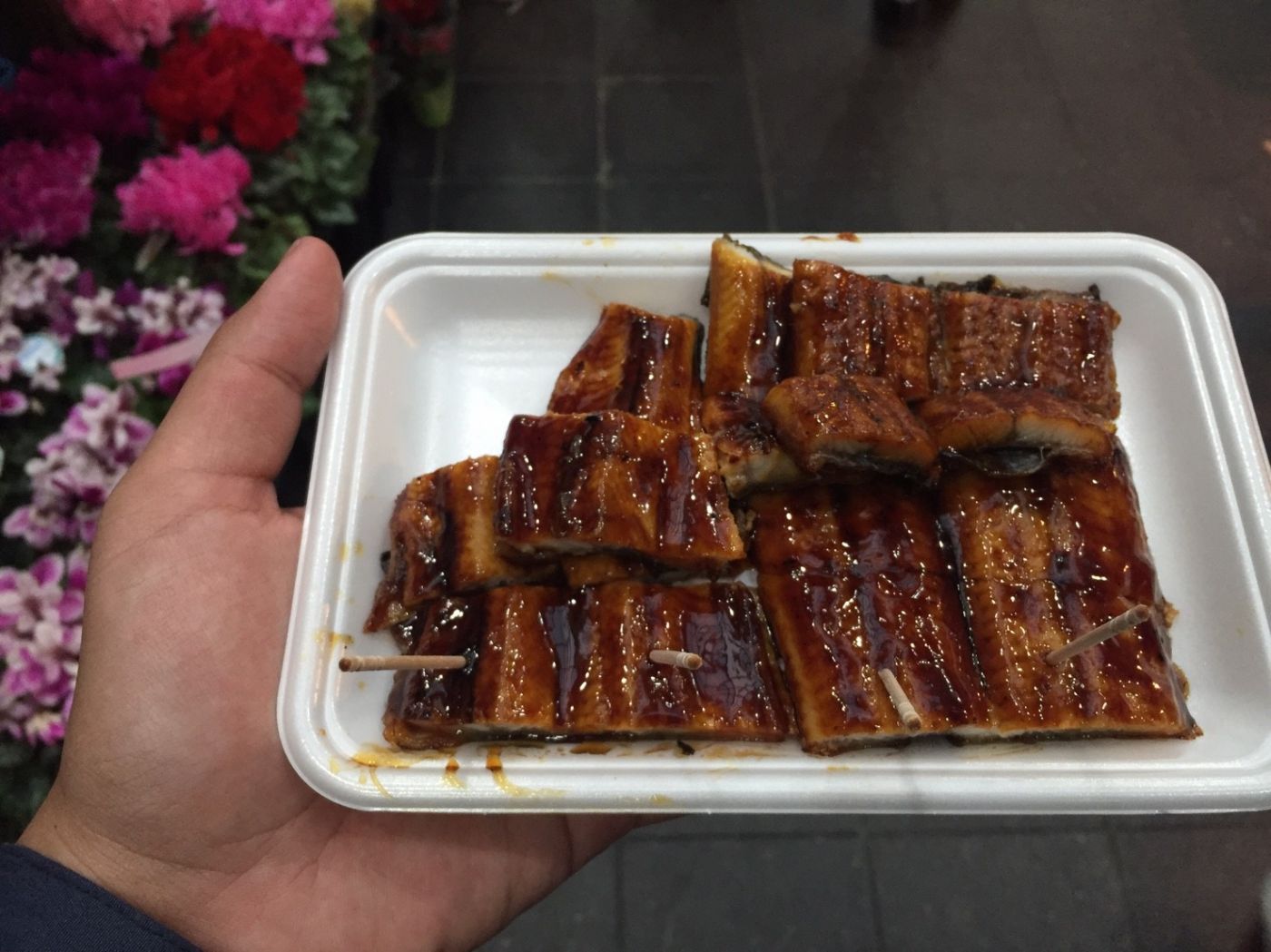 เดินๆ ได้สักพักพี่ปูก็หยุดที่ร้านขายปลาไหลย่าง พี่ปูโฆษณาให้ผมฟังว่าเคยมากินปลาไหลย่างที่นี่ พี่ปูบอกว่ารสชาติมันอร่อยมาก มันเข้มข้นรสชาติมันดีมาก พูดไปพลางพี่ปูก็จ่ายเงินซื้อปลาไหลย่างไปพลาง พี่ปูซื้อมาประมาณ 3 ไม้ไม้ละ 1,000 เยน สิริรวมแล้วราคาทั้งหมดแค่ถาดเดียว 3,000 เยน หรือเทียบเป็นเงินไทยก็ประมาณ 1,000 บาท…