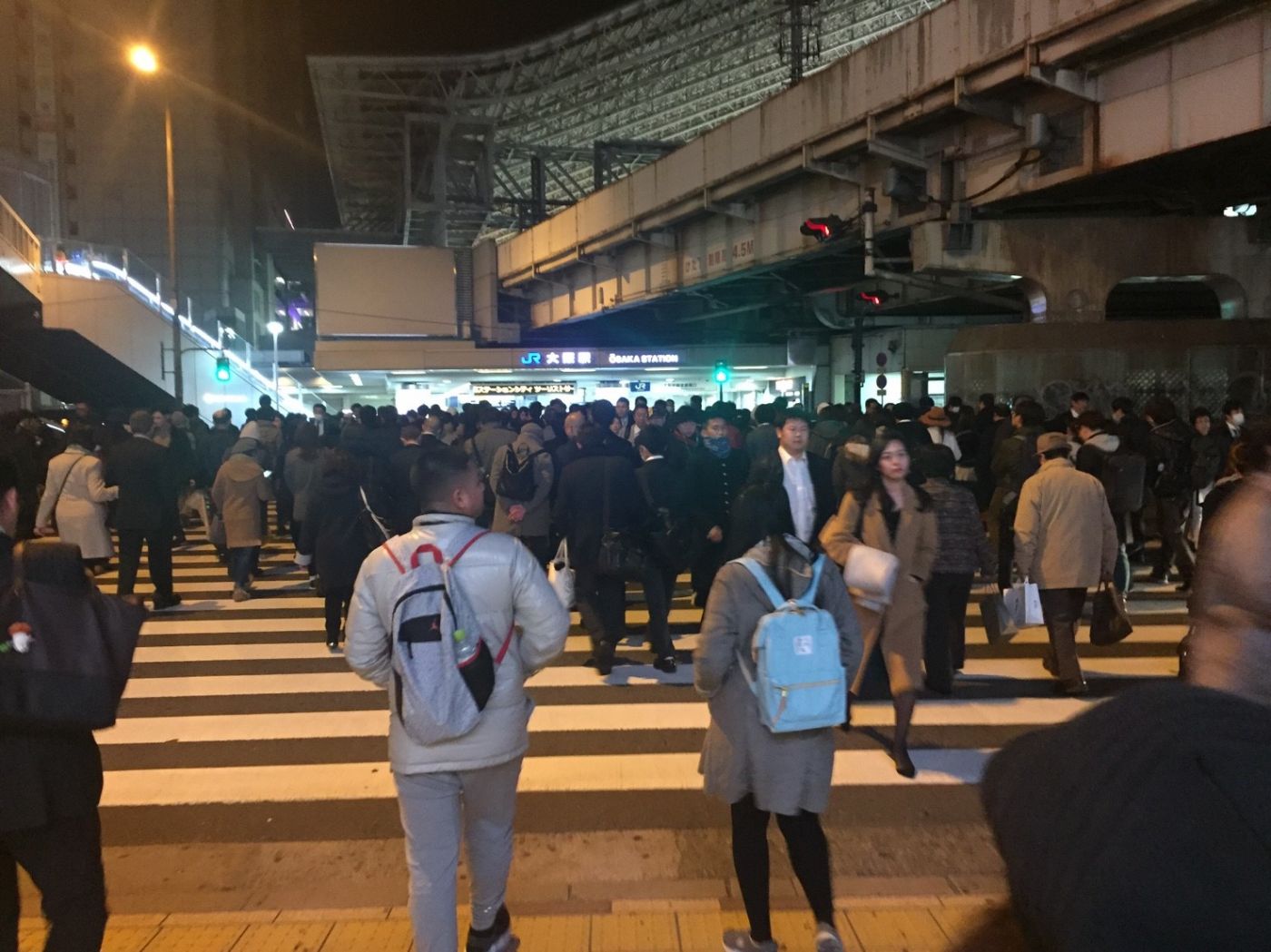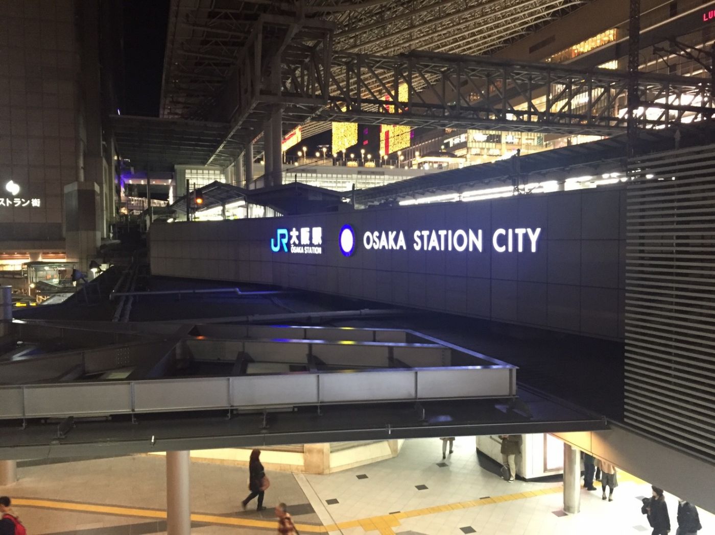 เราขึ้นรถไฟจาก Juso มุ่งหน้าไปยังสถานี Osaka เวลาตอนนั้นเพิ่งจะทุ่มกว่าแต่ท้องฟ้ามืดสนิทหมดแล้ว (ผมไปช่วงฤดูหนาวฟ้าเลยมืดเร็วหน่อย) ร้านรวงต่างๆ ก็เริ่มทยอยปิดทำการกันแล้วเราเลยไม่ได้เดินเที่ยวในตัวเมืองนัก ทำได้แค่เดินเที่ยวห้างแถวๆ นั้น
