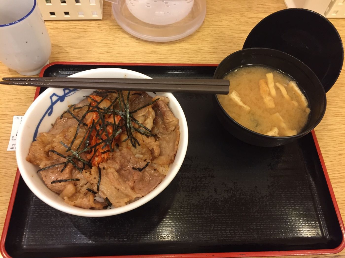 พี่ปูกับเท็นเห็นอย่างนั้นจึงพาผมและแม่ไปทานข้าวหน้าเนื้อแถวๆ นั้นกันก่อนที่จะเข้าบ้านนอน ผมสั่งข้าวหน้าเนื้อมาชุดนึงราคา 490 เยน รสชาติอร่อยใช้ได้เลยครับ ติดตรงที่ว่ามันน้อยไปหน่อย ไม่ค่อยจะกระทบกระเพาะหลุมดำของผมสักเท่าไรนัก ครั้นจะสั่งอะไรเพิ่มก็ยังไม่ค่อยกล้าเท่าไร ผมยังรู้สึกตื่นตระหนกในความต่างถิ่นอยู่ จะทำตัวเหมือนตอนกินข้าวร้านป้าแหม่มแถวมอไปก็ไม่น่าจะเหมาะสักเท่าไร...