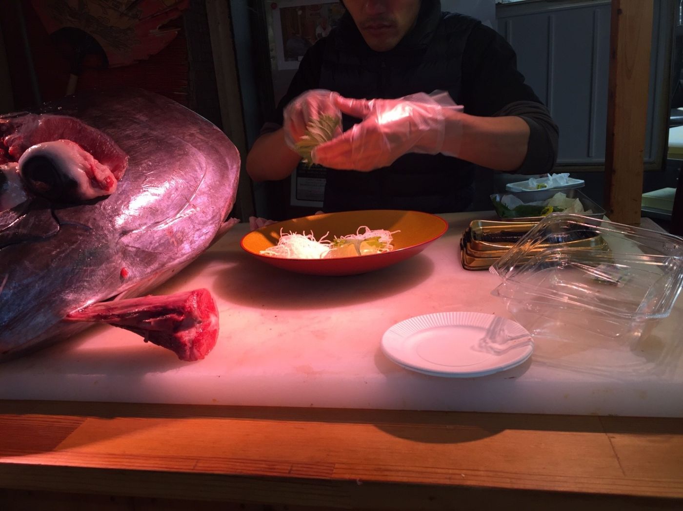 พี่ปูพาพวกเราไปยังร้านที่พี่ปูเคยมาร้านอยู่ในส่วนลึกๆ ของตลาด เราเลยต้องเดินลัดเลาะกันเข้าไประหว่างทางเดินผมเห็นร้านขายอาหารหลายชนิดทั้งอาหารสด เช่น พวกเนื้อวัวสดๆ เนื้อโกเบเนื้อวากิว เนื้อปลาซาซิมิ หรือร้านอาหารปรุงสุกแล้วอย่างแซลมอนย่างปลาไหลย่างราดน้ำซอส หรือพวกร้านเทมปุระก็มีให้เห็นอยู่ตลอดทาง
