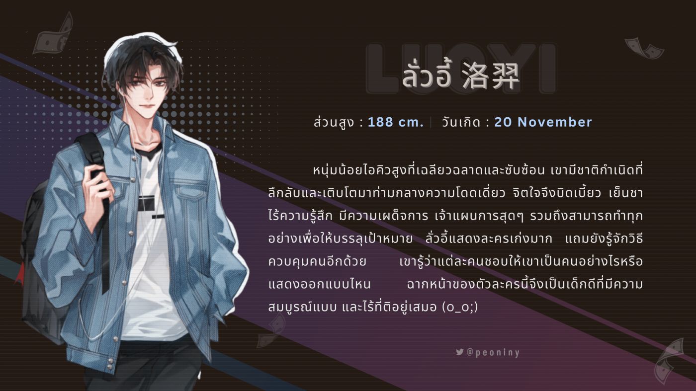 เนื้อเรื่องจะค่อยๆเผยถึงความฉลาด อันตราย และจิตใจบิดเบี้ยวของลั่วอี้ออกมาผ่านการแผนการอันล้ำลึก รวมถึงทักษะการแสดงของลั่วอี้ที่ต้องมอบออสก้าให้แร้ว! เปลือกแต่ละชั้นที่คุณนักเขียนห่อหุ้มตัวตนของลั่วอี้เอาไว้นั้น ยิ่งกระเทาะออกมาก็ยิ่งน่ากลัว บวกกับทำให้รู้สึกไม่ปลอดภัยสักนิด และอยากรู้มากว่าความดาร์กนี้จะไปสุดที่ตรงไหน (?)