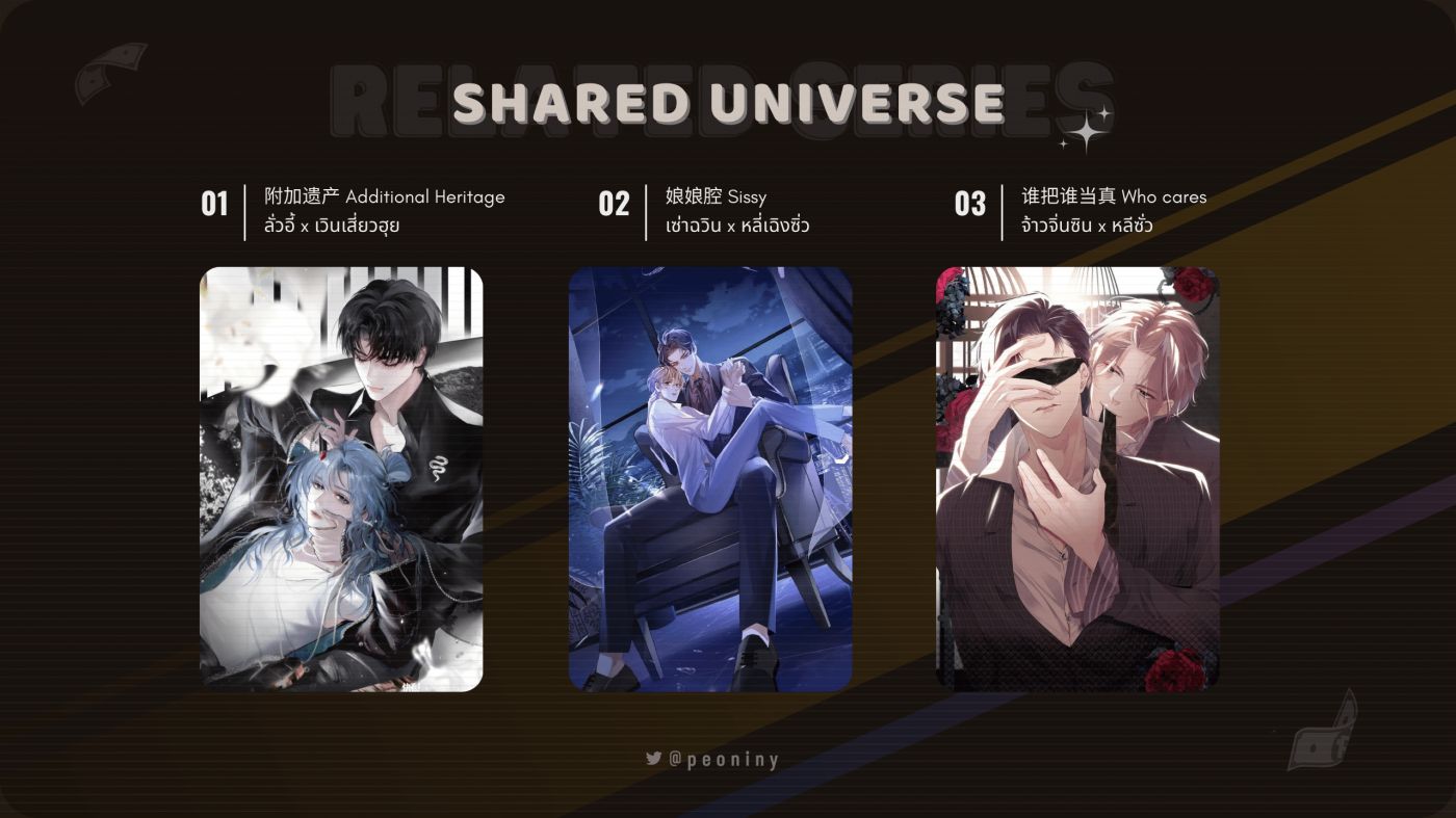 เรื่องนี้เป็นนิยายเรื่องแรกในแก๊ง 188男团 ที่เราอ่านเลยค่ะ และก็เป็นไปตามเสียงเล่าลือของพระเอกจักรวาลนี้จริงๆ ( ; ω ; ) เพราะน้องลั่วอี้ช่างเป็นหนุ่มน้อยที่มีจิตใจลึกล้ำ ซับซ้อน ซ่อนเงื่อนสิบแปดทบ น่ากลัวสุดๆเลย ส่วนความสัมพันธ์ของคู่หลักก็ค่อนข้าง Toxic หวานๆขมๆ จนต้องสูดยาดมตามเลย ดังนั้น NOT FOR EVERYONE! นะคะ แต่ถึงจะเป็นนิยายเรื่องแรกที่อ่าน แต่จริงๆเราเคยชิมม่านฮวา Sissy ที่มี Timeline ตรงกับเรื่องนี้มาก่อน ซึ่งถ้าใครทนความบัดซบของคุณชายเซ่าใน Sissy ได้ เราว่าเรื่องนี้ก็น่าจะชิลๆเลยค่ะ 555 โดยนิยายจักรวาลเดียวกับ มรดกลวงรัก มี 2 เรื่องคือ