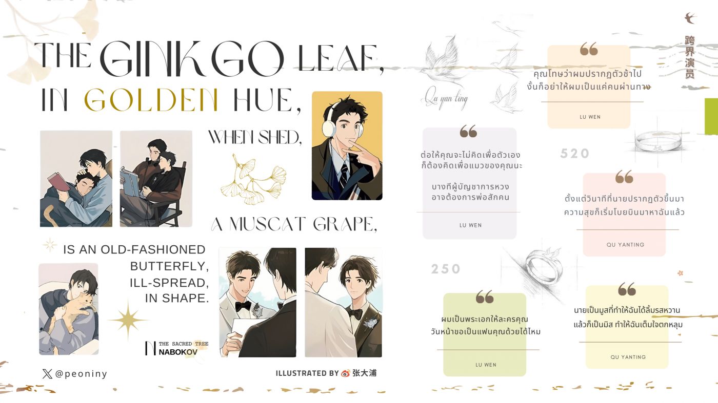 แต่เมื่อมีลู่เหวินก้าวเข้ามาปลอบโยนความเจ็บปวด และฉุดดึงเขาไปยังแสงสว่าง การแสดงออกของฉวีเยี่ยนถิงเริ่มเป็นธรรมชาติมากขึ้นเรื่อยๆ ทั้งชอบพูดล้อเล่น มีความมั่นใจ และกล้าที่จะลองอะไรใหม่ๆ โดยที่เขาเองก็ไม่รู้ตัวเลยว่าตัวเองเปลี่ยนไปมากแค่ไหน เราชอบประโยคที่ลู่เหวินพูดว่า เพราะความรักทำให้คนเราเป็นเด็ก แต่ก็ทำให้คนเราโตขึ้นเหมือนกัน ความรักทำให้ฉวีเยี่ยนถิงกล้าแสดงความอ่อนแอ ทดลองทำตัวเป็นเด็กๆ ออดอ้อน และพึ่งพาลู่เหวินราวกับช่วงวัยรุ่นที่มาช้าไปหลายสิบปี ส่วนลู่เหวินเองก็เติบโตขึ้นเพื่อเป็นที่พึ่งพิงให้คนรัก มันเป็นความสัมพันธ์ที่พวกเขาเติบโตไปด้วยกันแต่ก็เหมือนไม่ได้เปลี่ยนไปเลย เพราะมันคือการเติบโตที่ยังคงตัวตนของตัวเองไว้นั่นเอง