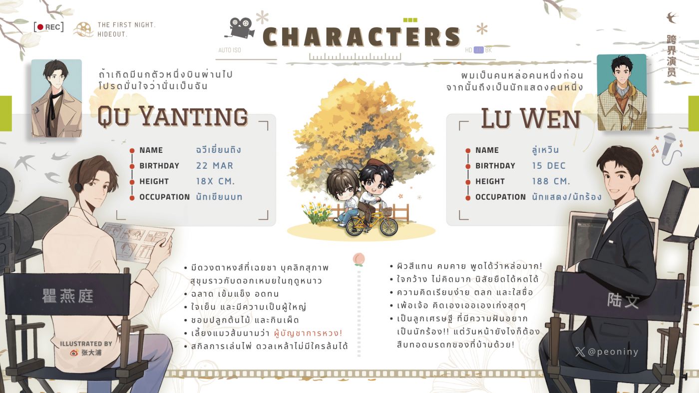 สำหรับเซตติ้งวงการบันเทิงของเรื่องนี้อาจต่างไปจากเรื่องอื่นๆตรงที่ใช้การทำงานเบื้องหลังมาเป็นตัวชูโรง ช่วงแรกจะเป็นพาร์ทถ่ายทำซีรีย์ ค่ำคืนแรก ที่แค่ฉากแรกที่ลู่เหวินไปถึงกองถ่ายก็สามารถดึงเราเข้าไปในเซตติ้งของละครได้อย่างน่าประทับใจเลย ส่วนความพิเศษของละครเรื่องนี้จะเป็นการค่อยๆพาคนอ่านไปทำความรู้จักกับอดีตฉวีเยี่ยนถิงผ่านตัวละครที่เขาสร้างขึ้นมา การแสดงบทพระเอกจะค่อยๆทำให้ลู่เหวินมองเห็นเงาของใครบางคนซ้อนทับบนตัวละครนั้น และกลายเป็นแรงดึงดูดที่ทำให้ลู่เหวินเริ่มสงสัย อยากทำความเข้าใจฉวีเยี่ยนถิงมากขึ้นเรื่อยๆ ซึ่งมันนำไปสู่ character development ของลู่เหวินและฉวีเยี่ยนถิงที่เราชอบมากๆ นั่นเอง