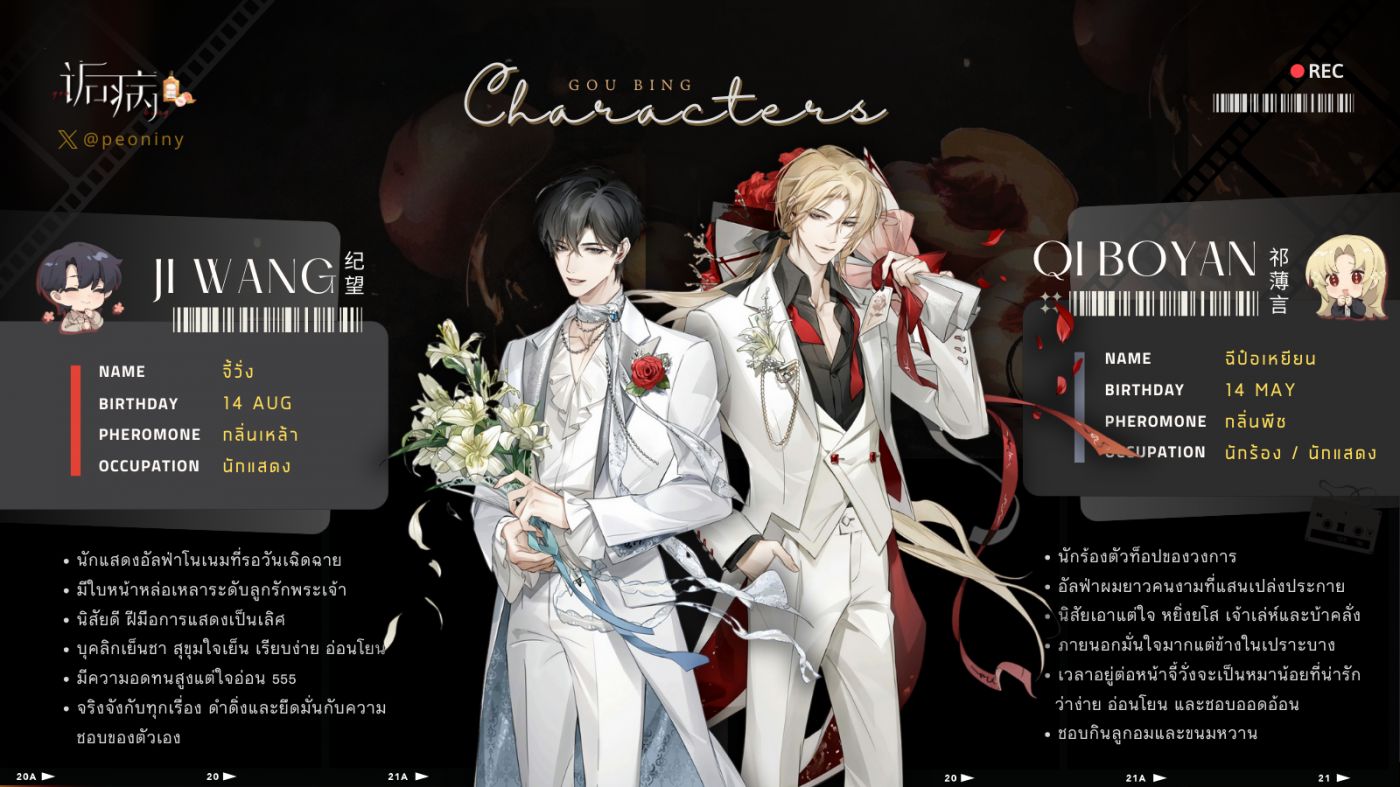 จี้วั่ง ‒ นักแสดงอัลฟ่าโนเนมที่รอวันเฉิดฉาย หน้าตาดีมาก ฝีมือการแสดงเป็นเลิศ บุคลิกสุขุมใจเย็น นิสัยดี เรียบง่าย อ่อนโยน มีเหตุผลและมีความอดทนสูง แต่ใจอ่อนมาก 555 นอกจากจริงจังกับทุกเรื่องแล้ว เขายังยึดมั่นกับความชื่นชอบของตัวเองมากอีกด้วย ⌜ฟีโรโมนกลิ่นเหล้า 🥃⌟