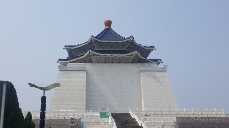 อาคารอนุสรณ์สถานเจียงไคเช็คสีขาวตัดกับหลังคาสีน้ำเงิน ก็ดูสวย เรียบง่าย แต่รู้สึกหนักแน่น มั่งคง ทรงพลัง ภายในจะพบกับโถงขนาดใหญ่เพดานสวยด้วย