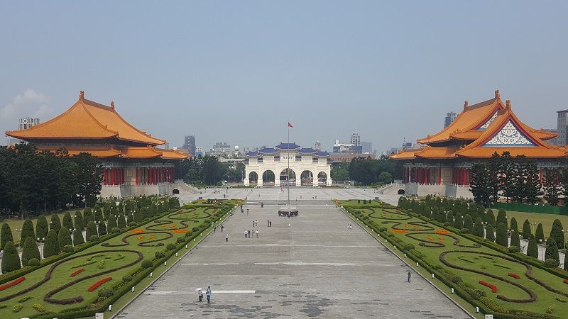 โลมาชอบซุ้มประตูทางเข้าอนุสรณ์สถานเจียงไคเช็คสีขาวตัดกับหลังคาสีน้ำเงิน เดินเข้ามาก็เป็นลานกว้างขนาบด้วยสวนตกแต่งลวดลายดูสวยดี