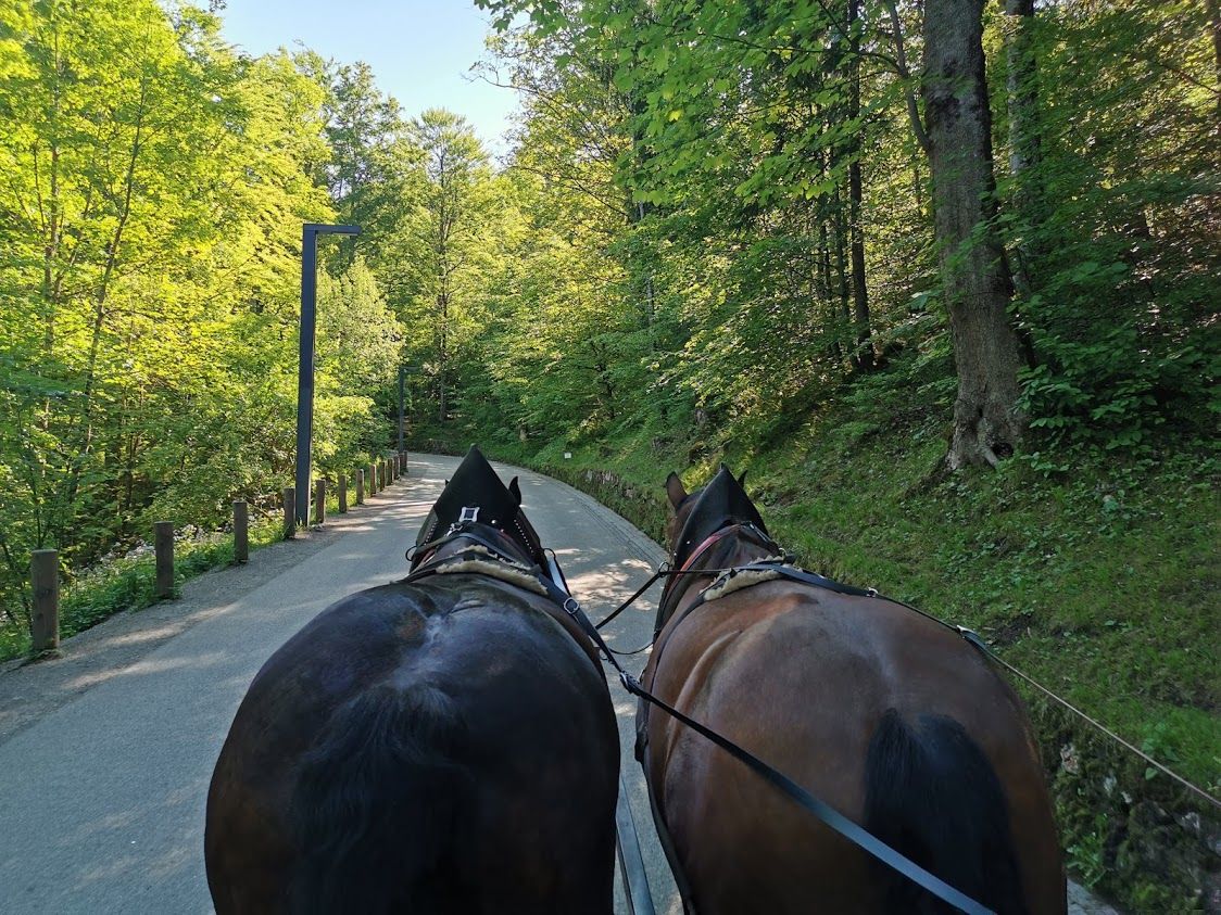 การขึ้นปราสาทนอยชวานสไตน์โดยรถม้านั้นจะมีราคาสูงกว่าโดยรถบัส แต่ถ้าใครอยากดื่มด่ำบรรยากาศบนเขา กินลมชมวิวอย่างเต็มที่ รถม้าเนี่ยแหละคุ้มค่าที่สุด