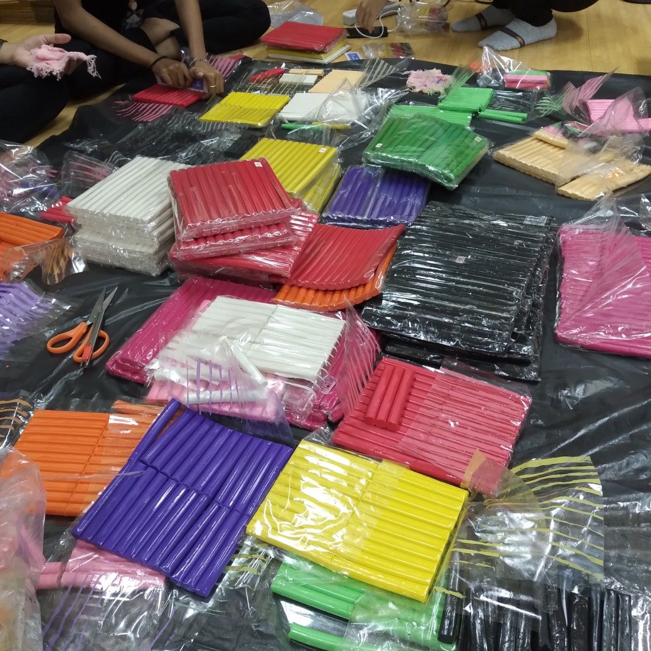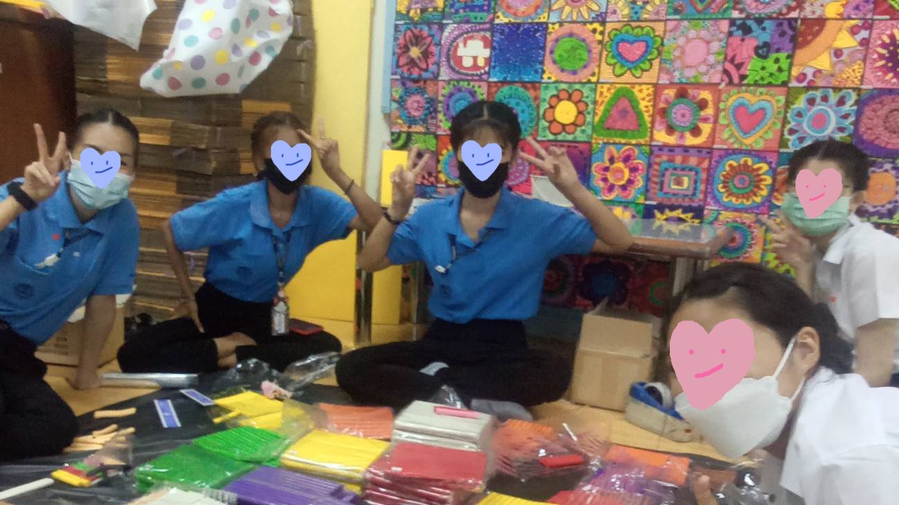 แต่เนื่องจากเราต้องใช้ดินน้ำมันจำนวนมาก พวกเราเลยต้องไปยกดินน้ำมันที่เก็บเอาไว้ด้านล่างขึ้นมาบนห้องพักครูค่ะ ขอกระซิบว่าขึ้นลงกระไดหลายรอบมาก แต่เพราะพลังหญิงของแผนกศิลปะทำให้เรายกขึ้นมาได้ครบตามจำนวนที่ต้องการ (พวกเรานี่เก่งที่สุด ✨?) หลังจากนั้นเราก็นำดินน้ำมันมาตากเพื่อไม่ให้ดินน้ำมันเหลวจนเกินไป ก่อนจะแยกสีรวมถึงแยกจำนวนของแต่ระดับชั้นกัน เรียกได้ว่าเกือบทั้งสัปดาห์ เรายุ่งไปกับการเตรียมดินน้ำมัน แพ็คใส่ถุง เตรียมส่งมอบให้คุณครูประจำห้องค่ะ