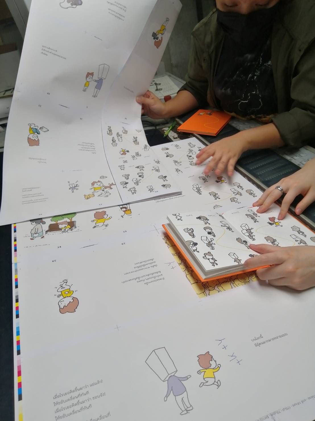 จากนั้นเราจึงเริ่มทัวร์โรงพิมพ์ภาพพิมพ์กันค่ะ พี่ไลลาจะพาไปดูตั้งแต่โซนกระดาษที่ใช้ในโรงพิมพ์ ทั้งตัวรูปเล่มจนถึงจั่วปัง จากนั้นจึงเป็นการตัดขอบกระดาษและการจัดหน้ายกเตรียมเข้าเล่ม แล้ววนกลับมาดูที่แท่นสีอีกครั้งเพื่อความเข้าใจอย่างละเอียดว่ามีตู้สีกี่ตู้ก็จะพิมพ์ได้สีเท่านั้นไป แล้วก็ไปดูในโซนของการผสมสี เพราะบางครั้งสีที่ตัวปกบรีฟมาก็ไม่มีอยู่ใน CMYK ค่ะ แล้วจึงได้มาดูในส่วนด้านหน้า เช่น การพิมพ์ฟรอยสี ๆ เช่น สีเงิน สีทอง ที่ต้องแกะภาพจากนั้นใช้ความร้อนเพื่อฝังหนังสือ ตัวอย่างจั่วปัง การเข้าเล่มไสกาว การพิมพ์แบบสปอต จากนั้นจบลงที่การซีลเล่มเตรียมจัดส่งค่ะ