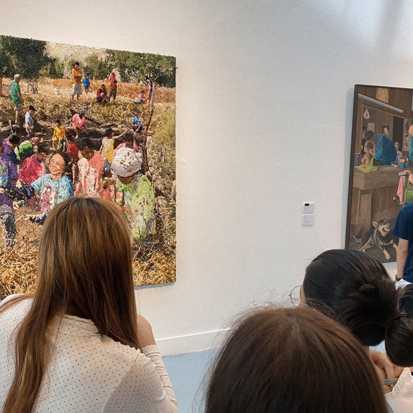 พี่ ๆ เจ้าหน้าที่ฝ่านการศึกษา พาพวกเราชมนิทรรศการ (เป็นการนำชม) ทำให้เราได้รู้ขั้นตอนของการนำชมกลุ่มผู้ที่มาชมงานศิลปะ พี่ ๆ จะคอยแนะนำให้สังเกตจุดต่าง ๆ ในงานศิลปะ ทำให้รู้สึกว่าการมาดูศิลปะครั้งต่อไปของเราจะไม่เหมือนเดิมอีกต่อไป