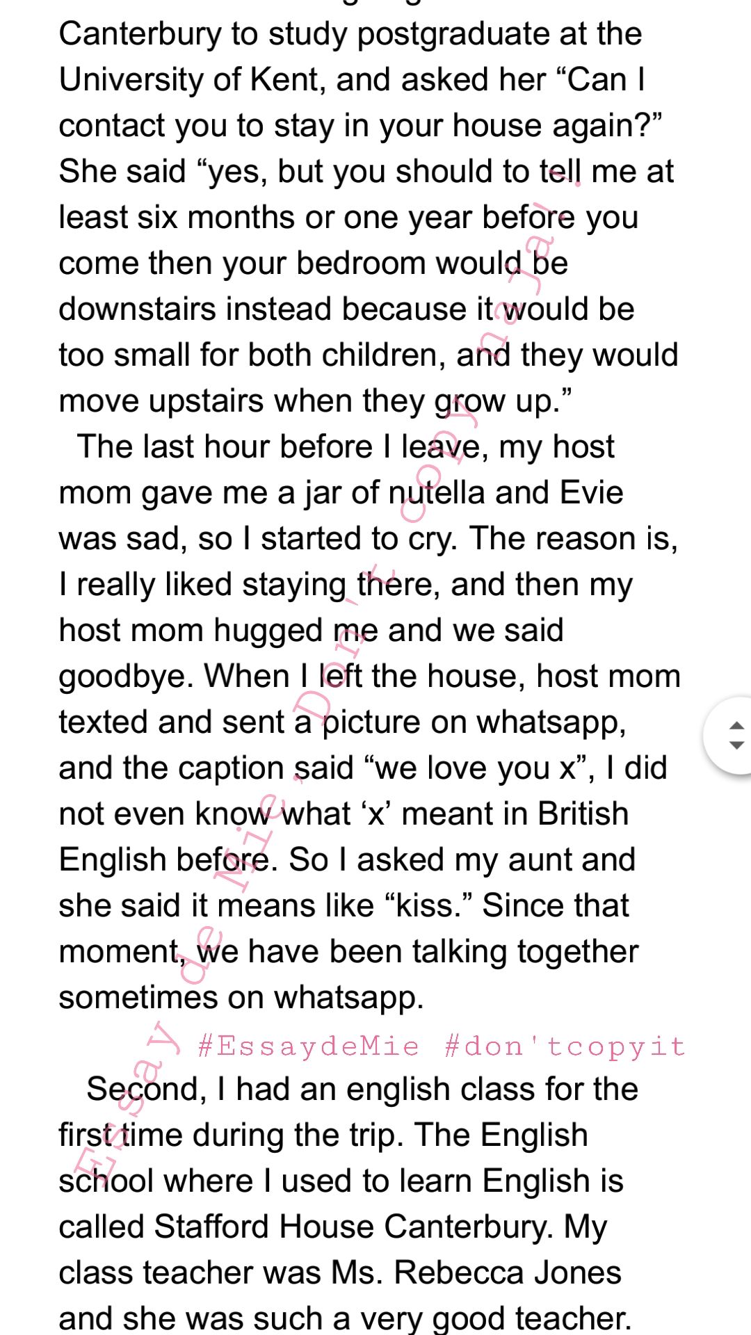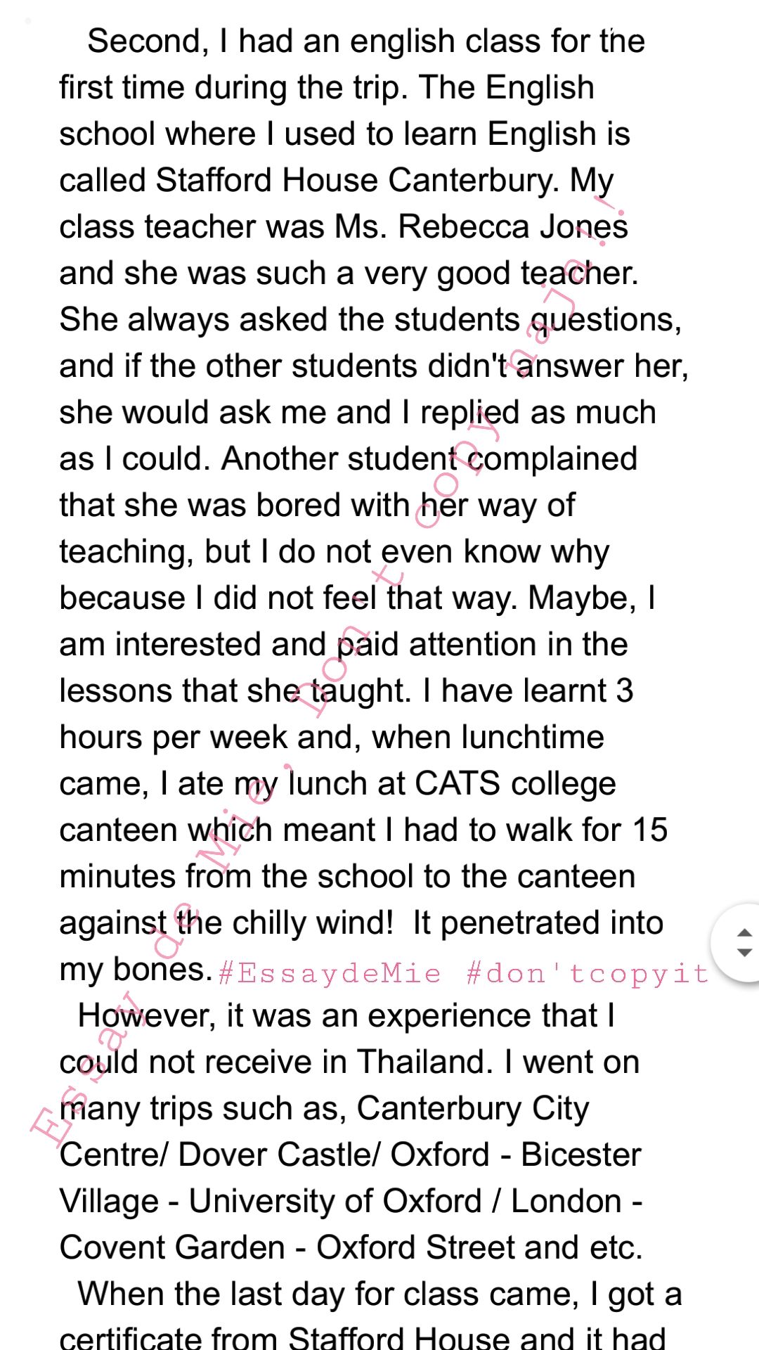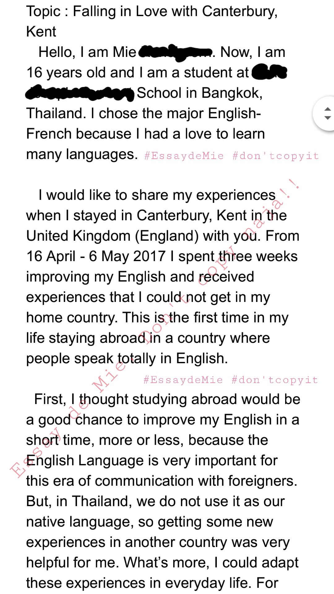5. เขาจะมีให้เขียน essay ด้วย เรื่องอะไรก็ได้ เขาไม่ได้บังคับไว้ จะเขียนแนะนำตัวเองก็ได้ แต่ต้องเขียนด้วยลายมือเท่านั้น แต่ของเราเขียนเรื่อง Canterbury ค่ะ (สืบเนื่องจากบล็อกอันก่อนหน้านี้ของเรา ที่ตอนนี้มีคนอ่านครบพันคนแล้ว เราดีใจมากค่ะ ขอบคุณมากค่ะ ส่วนนี่คือลิ้งค์บล็อกแรกของเรา https://minimore.com/b/3hxH5/1 ) แต่ที่เราเขียน essay อันนี้เป็นฉบับ(ย่อ)ภาษาอังกฤษนะ เผื่ออยากอ่านตัวอย่างกัน แต่แบบ....เราอยากให้ Teacher อีกคนเข้ามาบล็อกนี้มาก เพราะเขาเป็น Teacher คนออสซี่ที่สอนอังกฤษอ่านเขียนให้เราที่โรงเรียน อันนี้เกี่ยวโยงกับตอนสอบ Speaking Test ของเขาที่เราเอาบล็อกและประสบการณ์ของเราใน Canterbury เล่าให้เขาฟังละก็ให้ลิ้งค์บล็อกไป เขาก็เลยไปเสพรูป เขาบอกว่า "เนื้อหาบนบล็อกยาวมาก ใช้เวลาอัพนานแค่ไหนเนี่ย ??? แต่รูปสวยดีนะ ฉันชอบเสพรูป ถึงแม้จะไม่เข้าใจภาษาไทยก็ตาม" (เพราะเขาอ่านภาษาไทยไม่ออกเนี่ยแหละ เลยอยากให้เขามาอ่านเนื้อหาย่อตรงนี้) แต่...ได้โปรดนะคะ ทุกคนเลย อย่าก๊อปเนื้อหาของเราไปนะคะ ? เราไม่อนุญาตให้ก๊อปไปโดยเด็ดขาดจ้า เน้นว่าเด็ดขาด