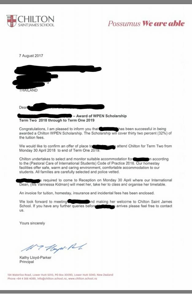 เอกสารจดหมายมาแบบทางการมากจ้าใต้วันที่ก็จะเป็นชื่อพ่อกับชื่อแม่ละก็ที่อยู่เรา ตรงหลังคำว่า Dear ก็จะเป็นชื่อละก็นามสกุลนักเรียนละหลังจากนั้นก็ตามในภาพเลยจ้า แต่ที่เราเอาสีดำมาขีดนั่นมันชื่อเราเองแหละ