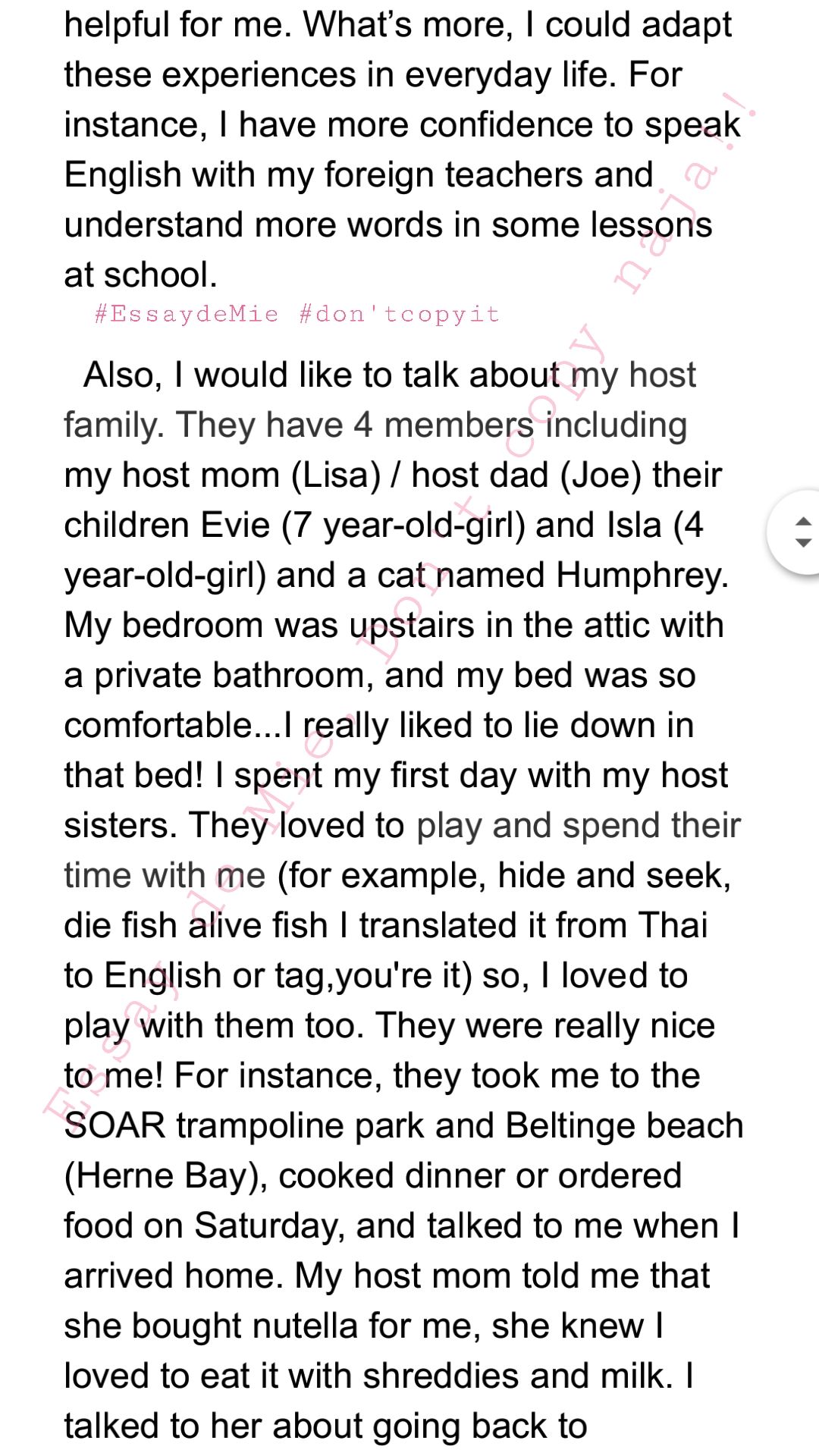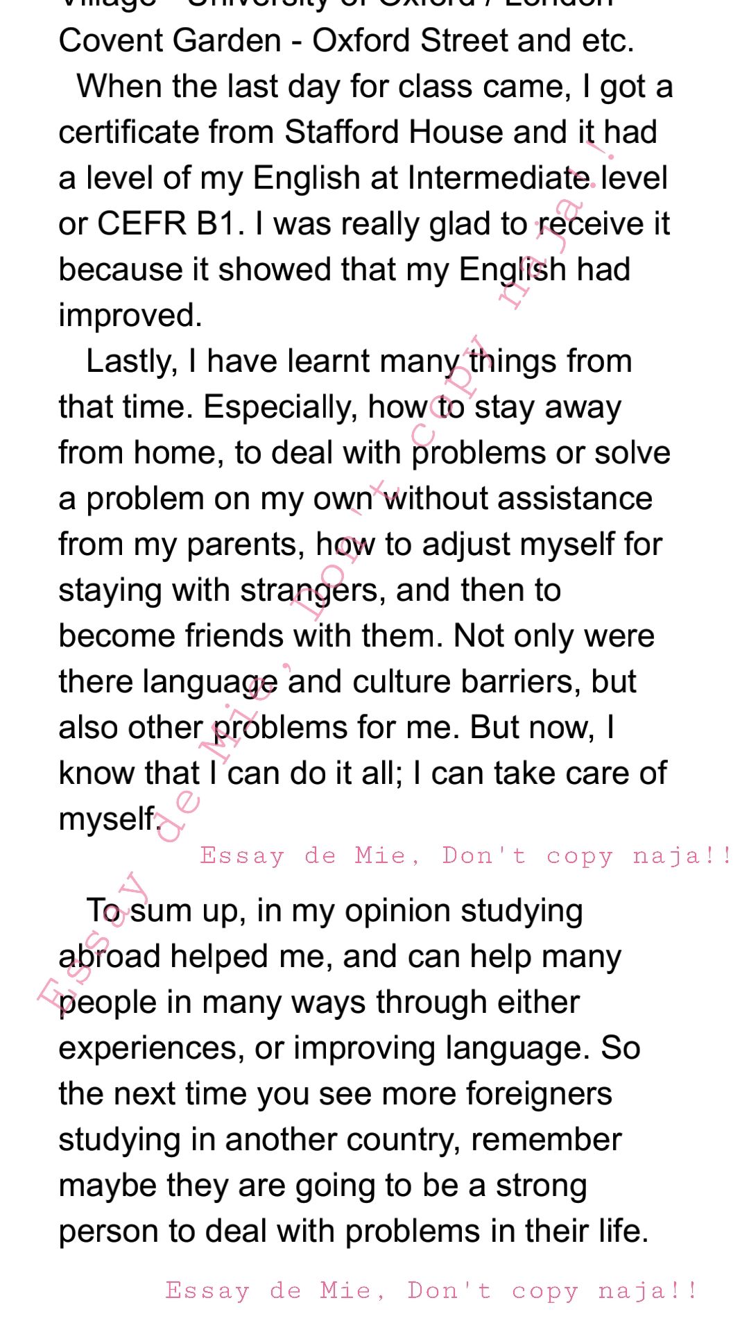 ปล. เผื่อบางคนไม่เก็ทพ้อยท์เราตรงย่อหน้าสุดท้ายที่สรุป สิ่งที่เราหมายถึงคือการอยู่ต่างประเทศคนเดียวโดยไม่มีคนในครอบครัวของเรามาอยู่ด้วยค่ะ ทำให้ต้องทำอะไรด้วยตัวเอง ประมาณว่าเราต้องฝึกหัดการแก้ปัญหาด้วยตัวเอง หรือประมาณ how to adjust myself to foreign friends (การปรับตัวเข้ากับเพื่อนต่างชาติ), different cultures (วัฒนธรรมที่แตกต่างจากประเทศไทย), staying away from my home and my family and how to live in a country where people speak in English when English is not my native language. (การที่อยู่ไกลจากบ้านเกิดเมืองนอนและต้องเรียนรู้การใช้ชีวิตในประเทศที่มีแต่คนใช้ภาษาอังกฤษเมื่อภาษาอังกฤษไม่ใช่ภาษาหลักของเรา)