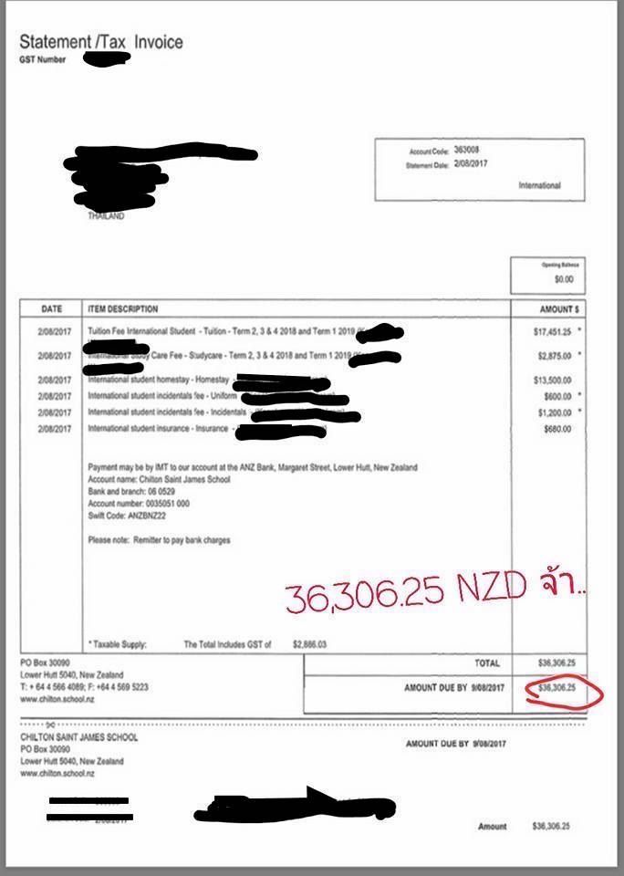 เบ็ดเสร็จโดยรวมที่ต้องจ่ายก็ยังถือว่าแพง คือ 36,306.25 NZD ประมาณ 873,662 บาท แต่เอาจริงถ้าแบบศึกษาพวกค่าเทอมในนิวซีแลนด์มาบ้าง อันนี้คือเกือบเท่ากับราคาค่าเทอมโรงเรียนหญิงล้วน (โรงเรียนรัฐบาล) ใน Auckland (เราเคยศึกษาราคาค่าเรียนของ Epsom Girls Grammar School สอน Year 9 ถึง Year 13 ราคาค่าเรียนแบบรวมทุกอย่าง 34,760 NZD ประมาณ 836,459.63 บาทต่อปี กับ Westlake Girls High School ราคา 32,535 NZD ประมาณ 782,917.55 บาท สกุลเงินอ้างอิงวันที่ 9 กันยายน 2560 เวลา 22.56 น. นะจ๊ะ) คือมันก็ไม่ต่างกันมากชะ แต่เห็นเขาบอกกันว่าสังคมเอกชนโรงเรียนนิวซีแลนด์จะดีกว่าโรงเรียนรัฐหน่อยและค่าใช้จ่ายก็สูงตาม แต่โรงเรียนรัฐก็น่าจะไม่แย่เบอร์นั้นนะ เราคิด เพราะคนกีวี่ก็เป็นมิตรพอควรอะ แต่อันนี้ขึ้นกับคนนะว่าปรับตัวเข้ากับคนได้มากแค่ไหน ประมาณซื้อสังคมอ่ะ