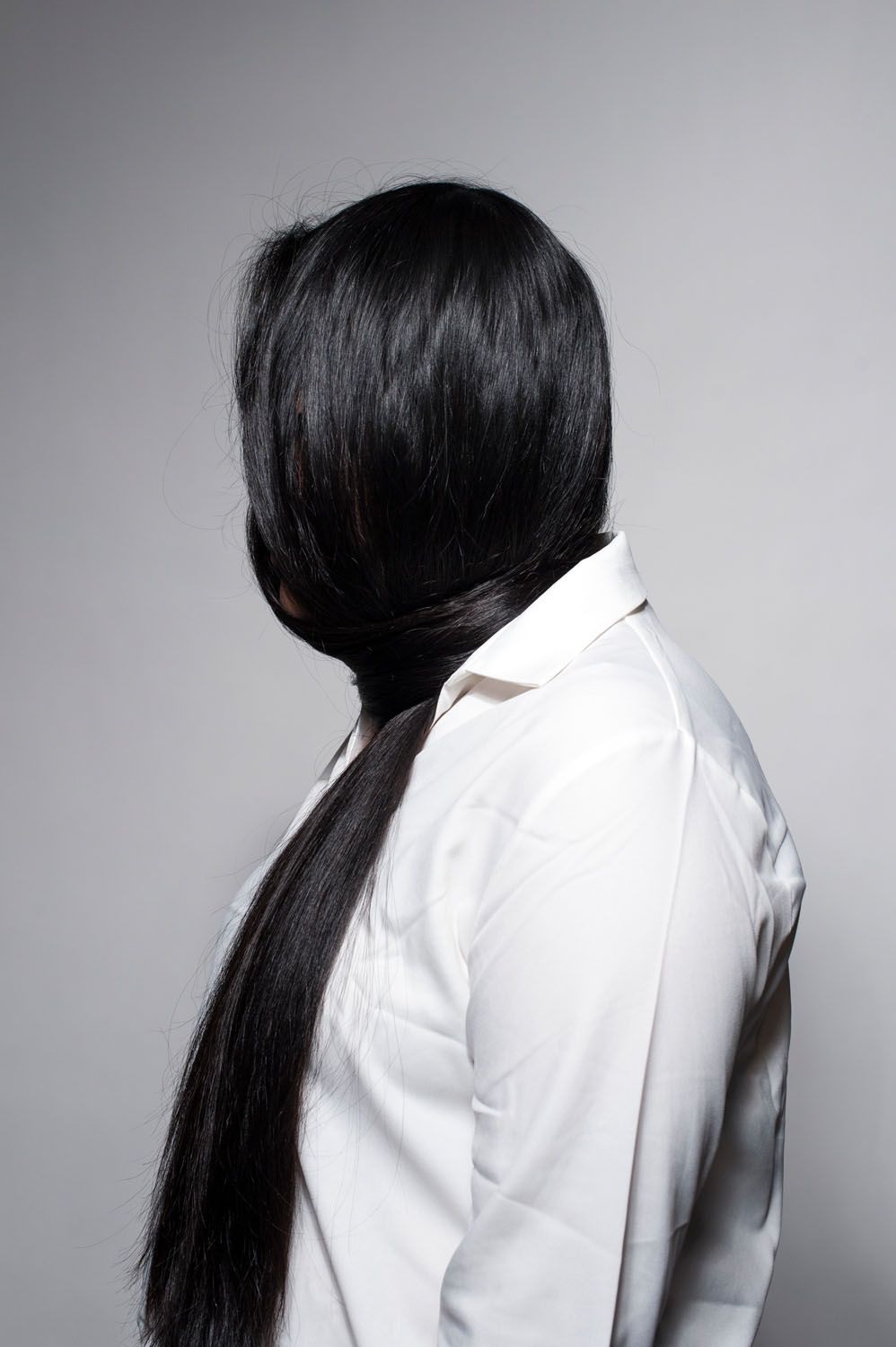 แล้วคุณก็ใส่เสื้อเชิ้ตสีขาวด้วย แบคกราวน์ก็เป็นสีขาว กางเกงสีดำก็ช่วยให้ผมคุณดูยาวลากลงไปอีก น่าจะน่าสนใจดี เพราะฉันไม่อยากถ่ายภาพแนวสะบัดผมแล้ว เคยถ่ายไปบ้างแล้วน่ะ เลยอยากได้อะไรแปลกๆบ้าง