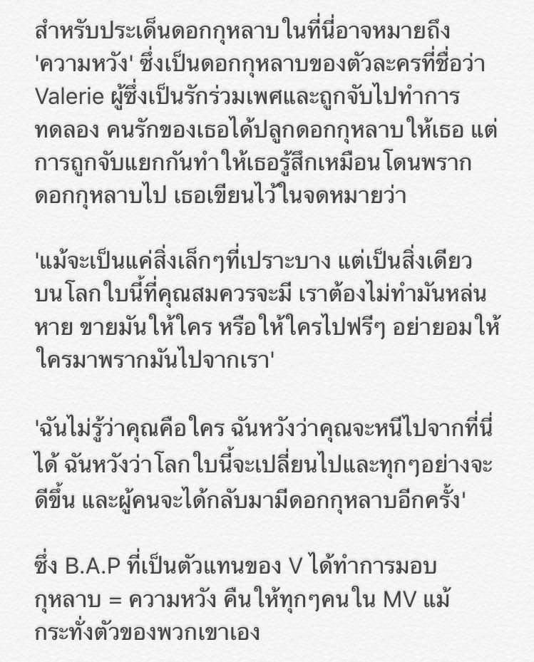 สำหรับประเด็นกุหลาบที่เรางงๆตอนแรกว่ามันหมายถึงอะไร มันเกี่ยวกับการเสียดสีสังคมยังไงนั้น มีคนวิเคราะห์ออกว่าอาจเป็นของตัวละครที่ชื่อว่า Valerie ที่ต้องการสื่อให้ทุกคนมีความหวัง (cr.