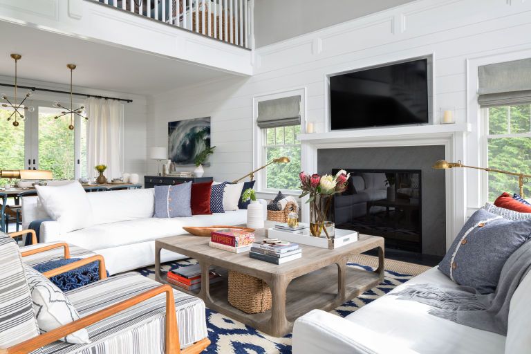 ห้องรับแขก ที่ชั้นแรกของตัวบ้าน เลือกใช้ชุดโซฟาสีขาวเป็นจุดเด่น และโต๊ะไม้สีน้ำตาลกาแฟยังทำให้นึกถึงบรรยากาศของชายหาด เพิ่มความโมเดิร์นด้วยโคมไฟคู่สีทอง ทีวีแบบบิวท์อิน และเตาผิงแบบร่วมสมัย ทำให้บริเวณนี้ดูหรูหรามากยิ่งขึ้น