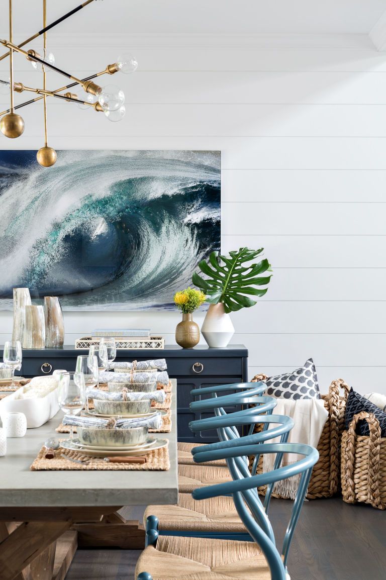 ห้องนั่งเล่น เลือกใช้โซฟาสีขาวสะอาดและเก้าอี้นวมหนังสีเขียว เพิ่มดีเทลด้วยโคมไฟไม้ไผ่ Ay Illuminateและวอล์เปเปอร์ลายทรอปิคอล เป็นการเลือกสีที่คอนทราสต์กับพาเลทสีแบบสุดโต่ง แต่มันก็ทำให้เราได้บ้านสไตล์ทะเลที่มีความทันสมัยแฝงอยู่
