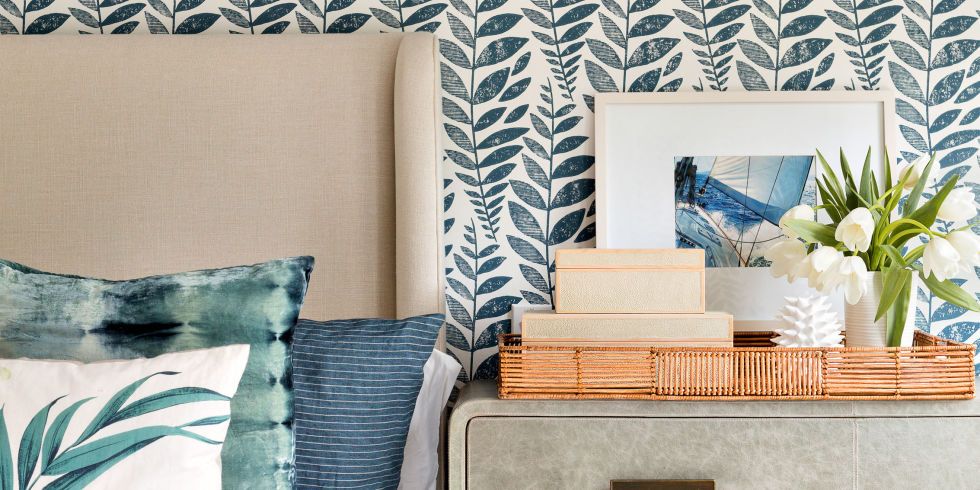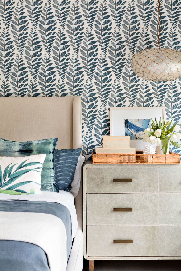 ห้องนอนสำหรับแขก เลือกใช้ตู้ลิ้นชักหนังจาก Made Goods และโคมไฟกระจกแบบห้อย ทำให้ห้องดูโมเดิร์นขึ้น