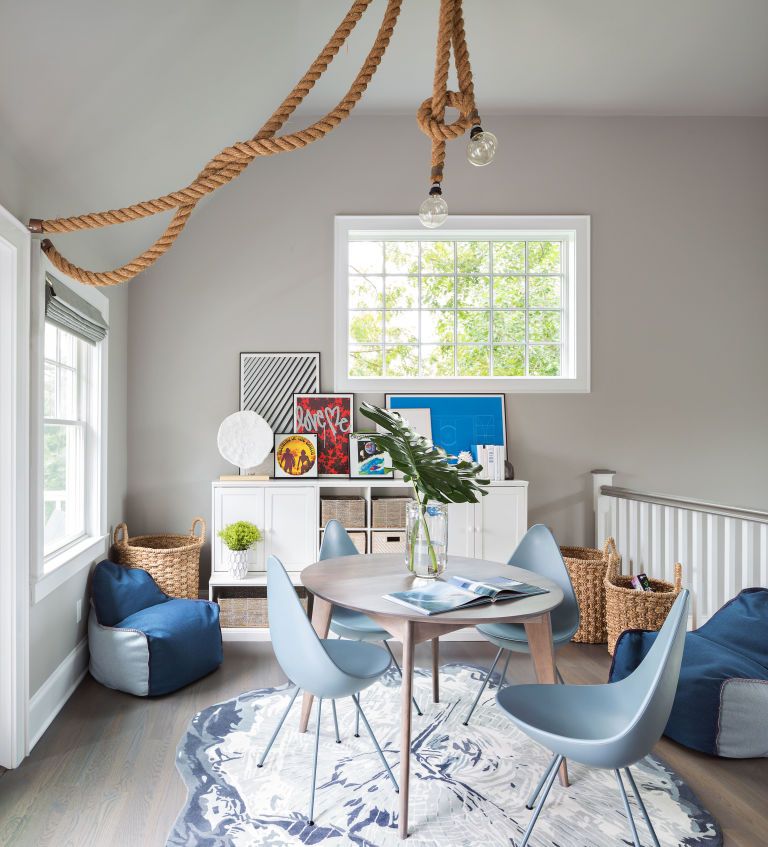ห้องเด็กเล่น เลือกใช้เก้าอี้สีฟ้าครามและบีนแบ็กสีกรมท่า จุดเด่นของห้องนี้อยู่ที่การนำเชือกน้ำตาลมาผูกติดกับหลอดไฟแล้วนำไปห้อยบนเพดาน ซึ่งสีของเชือกนั้น เข้ากันกับสีของตะกร้าตรงมุมห้องได้เป็นอย่างดี