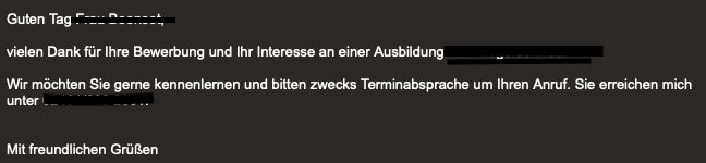 อ่านอีเมลปฏิเสธมาเป็น 10 ฉบับแต่ไม่เสียใจเลย บางอันตลกด้วยซ้ำเพราะเราไปสมัครทำสายที่แบบเบนไปจากที่เราเคยเรียนมาโดนสิ้นเชิง เช่น Bankkauffrau หรือตำแหน่งคนควบคุมรางรถไฟอะไรแบบเนี้ย555555 แต่เอาจริงๆ คือเราเข้าใจว่าทำไมส่วนใหญ่เค้าถึงปฏิเสธเราเพราะตอนนั้นเราเพิ่งเรียนจบแค่ A2 แล้วใบเทียบวุฒิแปลวุฒิอะไรเราก็ไม่มีทั้งนั้น พูดง่ายๆ ก็คือเอกสารไม่พร้อม เลยยยยย! แต่ก็ยังกล้าส่งไปสมัครอีก