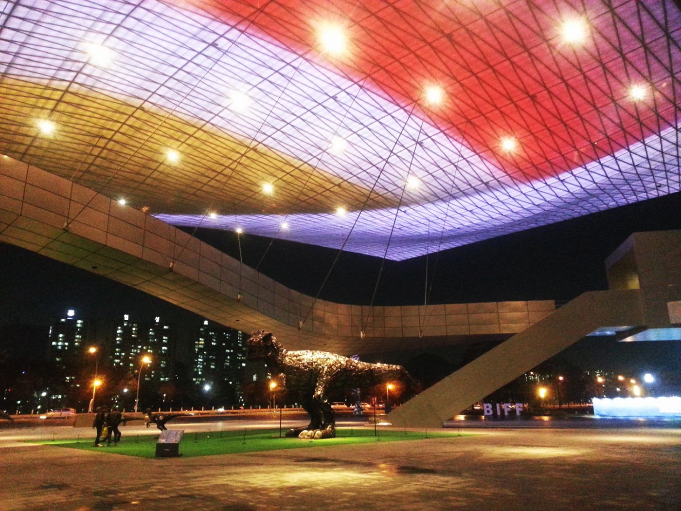เราจะสังเกตเห็นตึกที่มี curve แปลกๆ ถ้ามาตอนกลางคืนก็จะเห็นการเล่นแสงสี ที่นั่นแหละที่เป็นสถานที่จัดงานเทศกาลหนังนานาชาติพูซาน (Busan International Film Festival : BIFF) เดินเข้ามาจะเห็น พวกแสตนดี้หนังฮอลลีวู้ดให้ถ่ายรูป ที่ใต้หลังคาสีๆจะเป็นที่นั่งสำหรับดูภาพยนตร์ นอกจากใช้จัดเทศกาลแล้วที่นี่ก็เป็นโรงหนังจริงๆ ก็จะมีคนมาดูหนังตามปกติด้วย