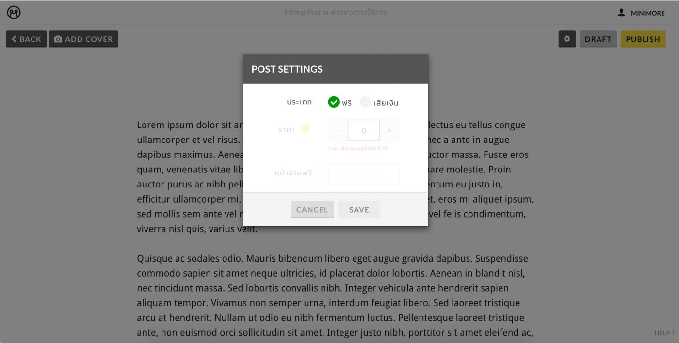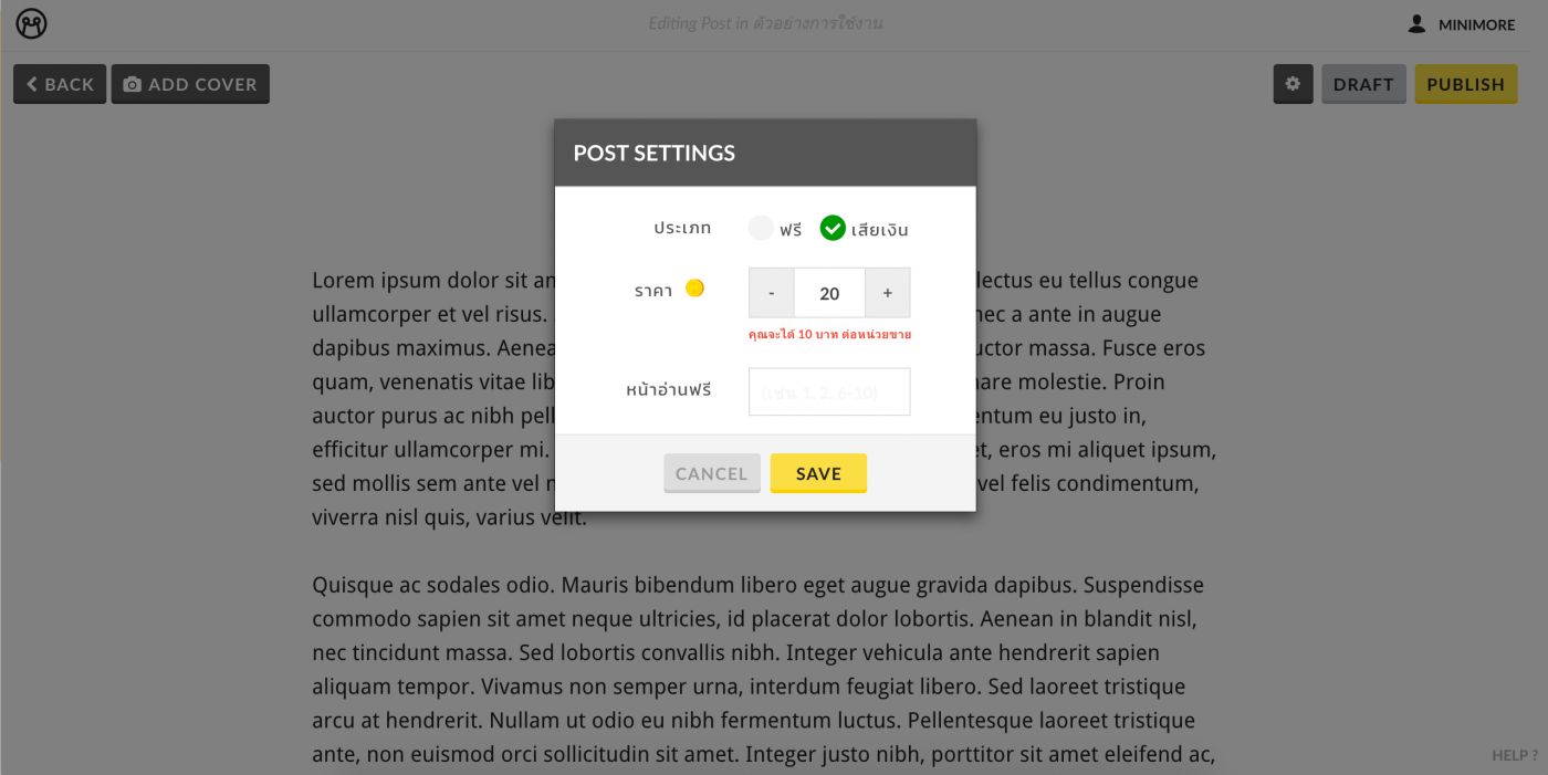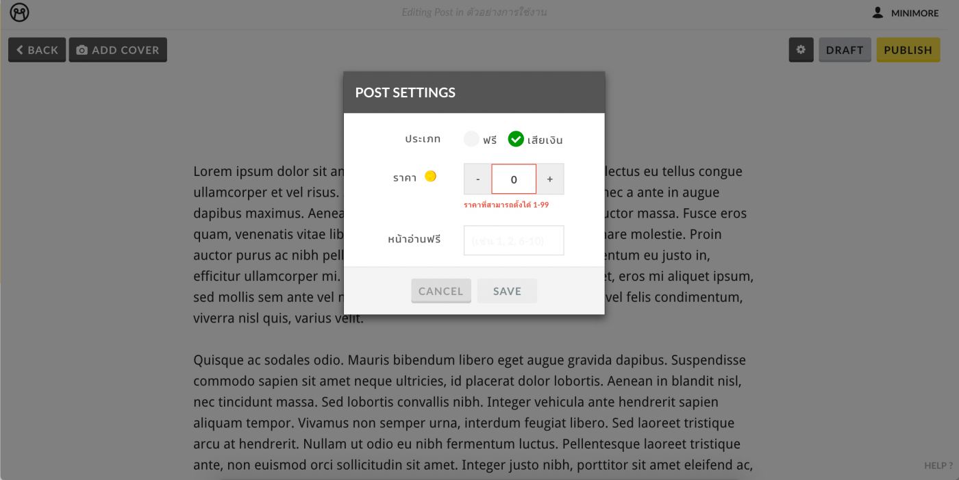 จำนวนตัวเลขที่เห็นคือราคาที่เราตั้งได้เองล่ะ ส่วนการตั้งราคาเป็นดุลยพินิจของเพื่อนๆ เลย ขอให้เหมาะสมกับเนื้อหาก็พอ (เพราะอย่างนี้มินิมอร์ถึงให้ทุกคนตั้งราคาเองไง เราต้องรู้ค่าของงานตัวเองดีสุดใช่ไหมล่ะ) อย่าลืมว่าตั้งราคาถูกไปหรือแพงไป ทุกอย่างมีผลกระทบทั้งนั้นเลยนะเอ้อ แต่อย่างไรก็ตาม...มินิมอร์คอยสอดส่องอยู่นะ!
