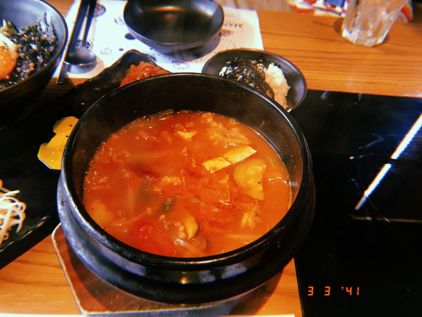 ซุปเทวนจัง จะออกเค็ม+เผ็ด แต่มีความกลมกล่อม ในซุปจะใส่ เต้าหู้ หมู หอยตลับ ผักกิมจิ เห็ดเข็มทอง และแตงกวา (อันนี้แอบงง ว่าใส่ทำไมนะ ไม่ค่อยเข้ากับรสชาติโดยรวมเท่าไหร่) ซึ่งเห็นหม้อเล็กๆแบบนี้ เครื่องแอบแน่นอยู่นะคะ ได้หอยตัวเล็กๆ (ก็มันหอยตลับนี่นา~) ประมาณ 5-6 ตัว ทานสองคนกำลังดีเลย