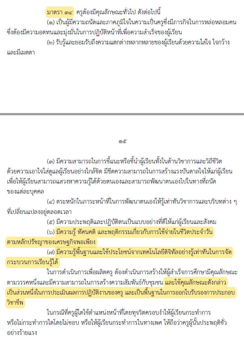 * มาตรา 34 นี้นำมาใช้บังคับผู้สอนในสถาบันอุดมศึกษาด้วยโดยอนุโลม (อันนี้ไม่ค่อยเข้าใจ แต่เหมือนว่าปกติ คุณสมบัติครูจะกำหนดแค่ถึงครูมัธยม แต่รอบนี้บังคับถึงครูระดับมหาลัยด้วย)