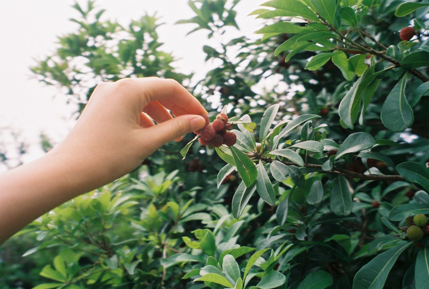 ต้นพีชป่าหน้าบ้านต้นนี้ มีผลยามะโมะโมะอยู่เต็มต้นไปหมด ทั้งสีแดงเลือดหมู แดงสด แดงปนเขียว และเขียว บอกระดับไล่จากสุกมากไปจนถึงยังไม่สุก แต่ก็กินได้หมดเลยแถมอร่อยด้วย