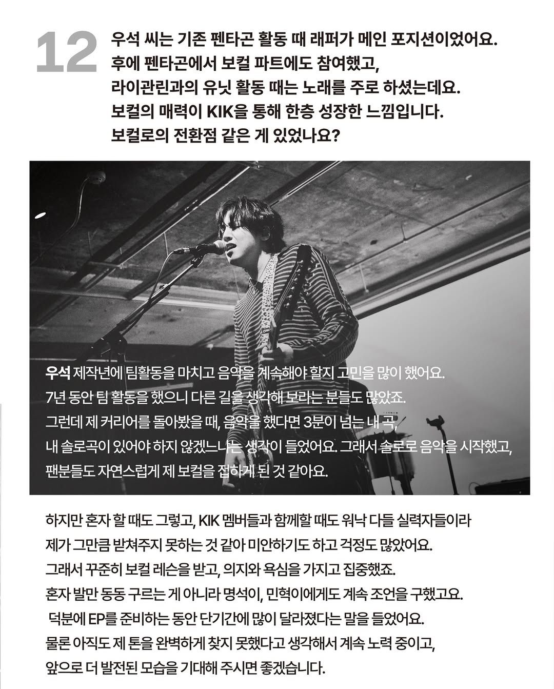 Q12. อูซอก เมื่อก่อนใน Pentagon เป็นแรปเปอร์หลัก หลังๆมาก็เริ่มร้องเพลงด้วย ทั้งในวงและในยูนิต พอมาเป็น KIK แล้วรู้สึกว่ามีเสน่ห์ด้านการร้