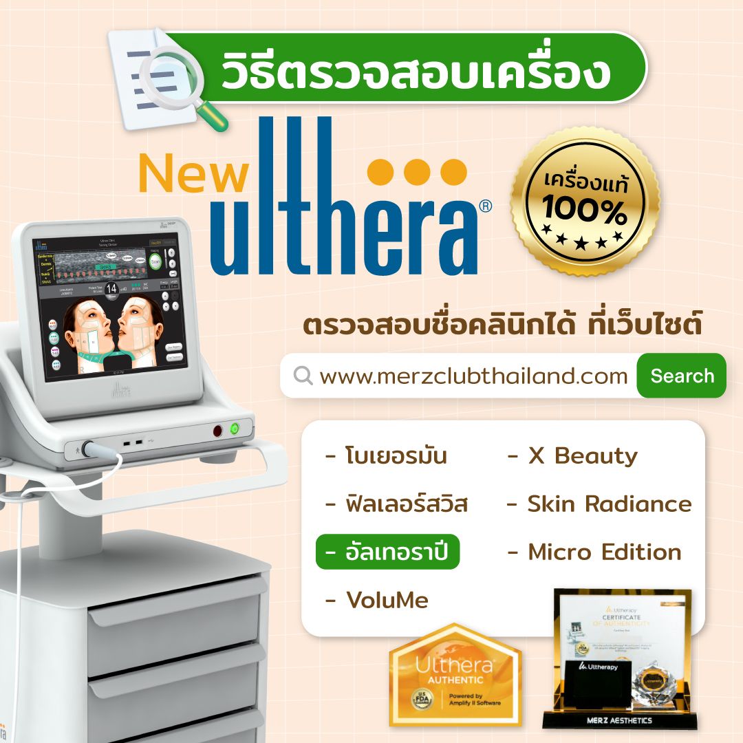 ตรวจสอบชื่อคลินิกว่าใช้เครื่อง Ulthera แท้หรือไม่ ได้ที่ https://www.merzaesthetics.co.th/