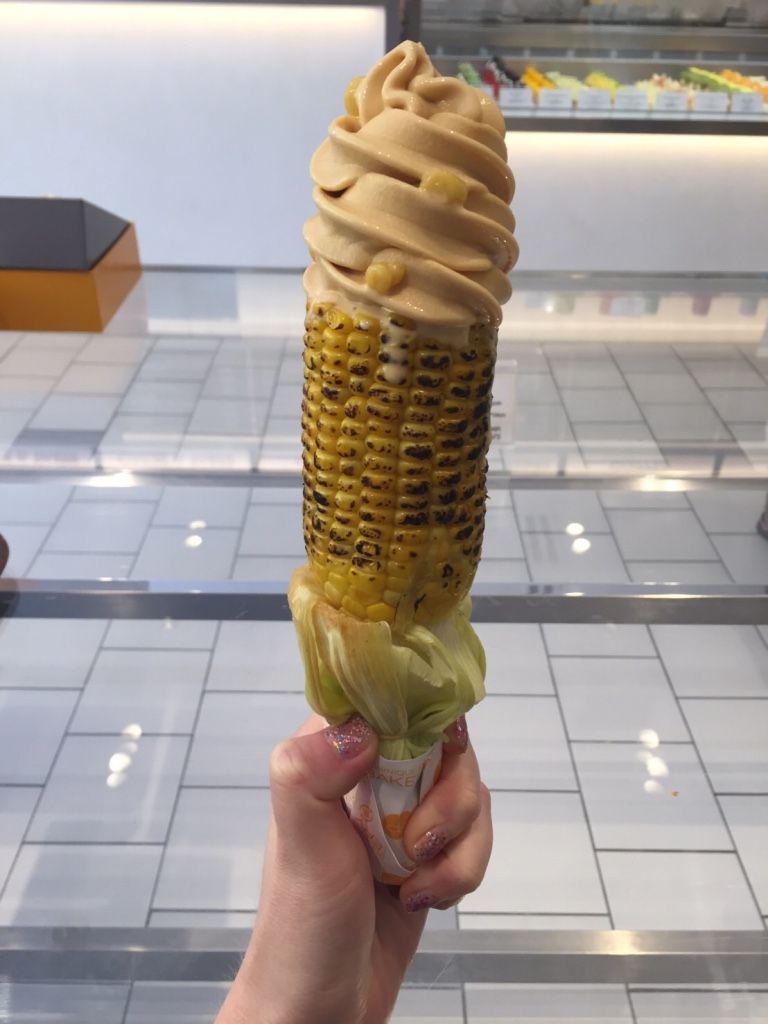 เมื่อเดินชม ถ่ายรูปจนพอใจ ที่ต่อไปคือร้าน Soft Serve Ice Cream ที่เธอหมายตาเอาไว้ เมนูที่ตามหาคือ ไอศครีมบนฝักข้าวโพด(จำชื่อไม่ได้)