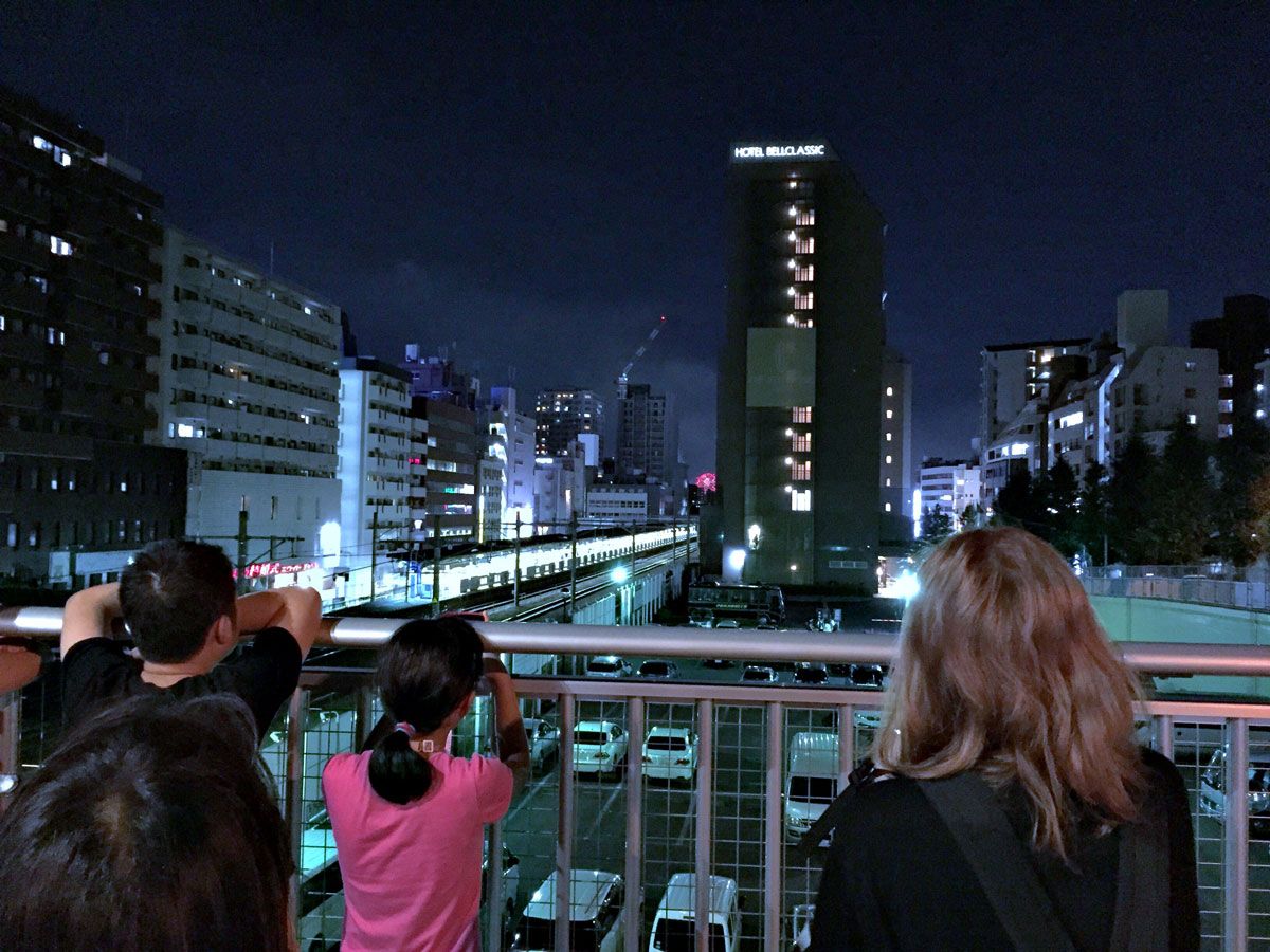 ผู้คนแวะดูดอกไม้ไฟ วันที่ผมไปบังเอิญตรงกับช่วงเทศกาลดอกไม้ไฟของญี่ปุ่นพอดี(จะมีในช่วงหน้าร้อน) แม้จะเห็นแค่ไกลๆ (ไกลมาก พยายามมองจุดกลมๆสีชมพูตรงซอกตึก) แต่คนญี่ปุ่นก็ยังตื่นเต้นกัน
